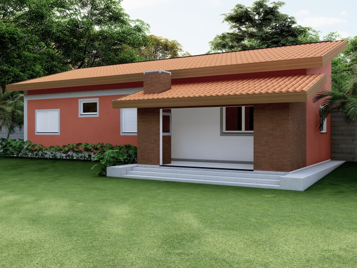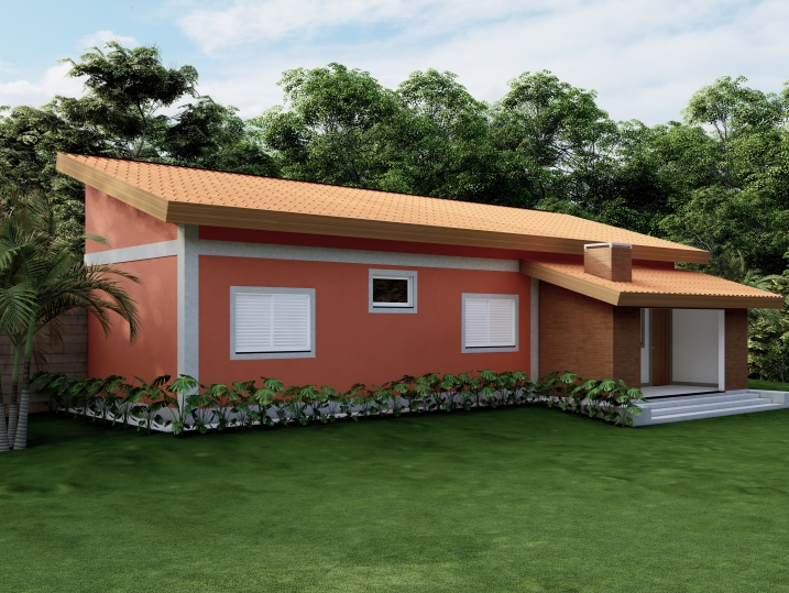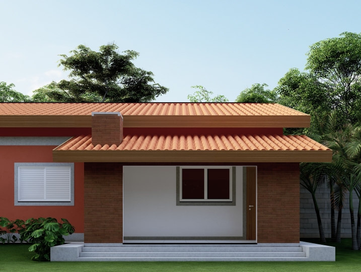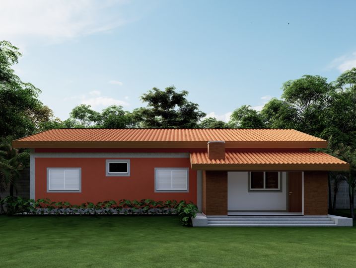 75,00m² de construção. A combinação do tom terracota vibrante com o telhado de cerâmica evoca o charme rústico e acolhedor das casas de campo em meio à natureza. O projeto térreo se destaca pelo uso da cor e do telhado aparente, inspirado no estilo rústico e cercado pelo verde. A fachada vibrante, as janelas simples e o generoso beiral conferem ao lar uma identidade marcante e uma sensação de descanso e tranquilidade.
