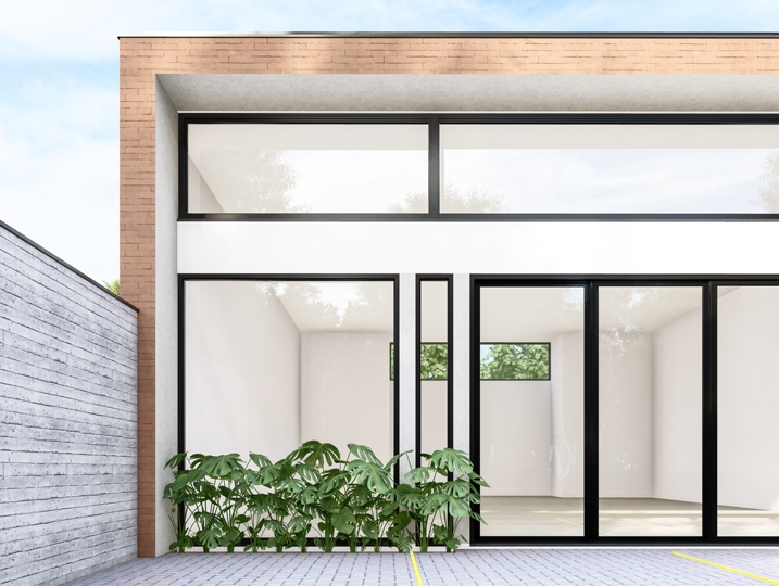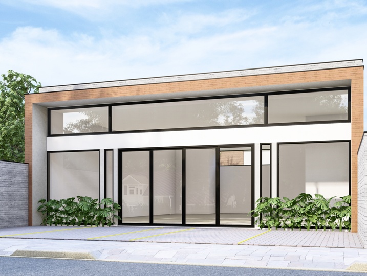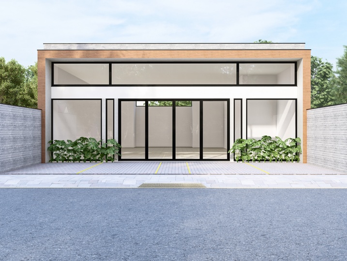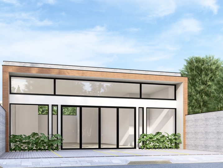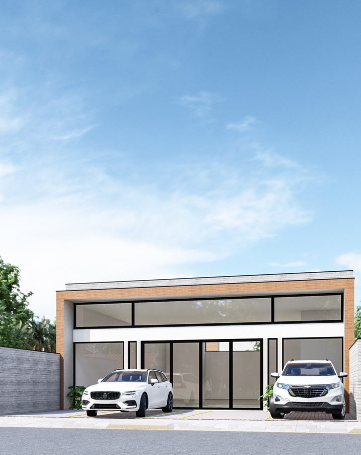 211,68m² de terreno, sendo 145,98m² de construção. Este projeto de salão comercial foi concebido para ser uma vitrine de alto impacto, combinando estética moderna e funcionalidade para atrair clientes e potencializar o negócio. A composição é marcada pela simplicidade geométrica, utilizando grandes planos em cor branca que criam uma base neutra e sofisticada. O interior foi projetado como um vão livre (planta aberta) para oferecer liberdade de layout, adaptando-se facilmente a diversos tipos de comércio. As paredes laterais em concreto aparente conferem um toque de robustez e estética urbana.
