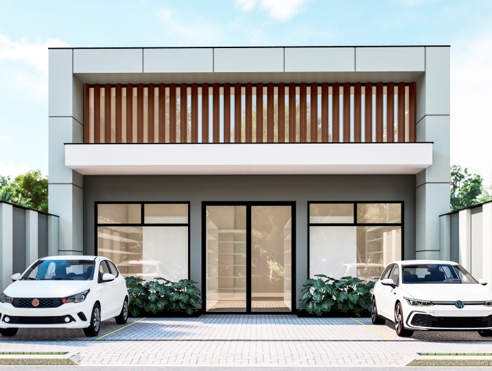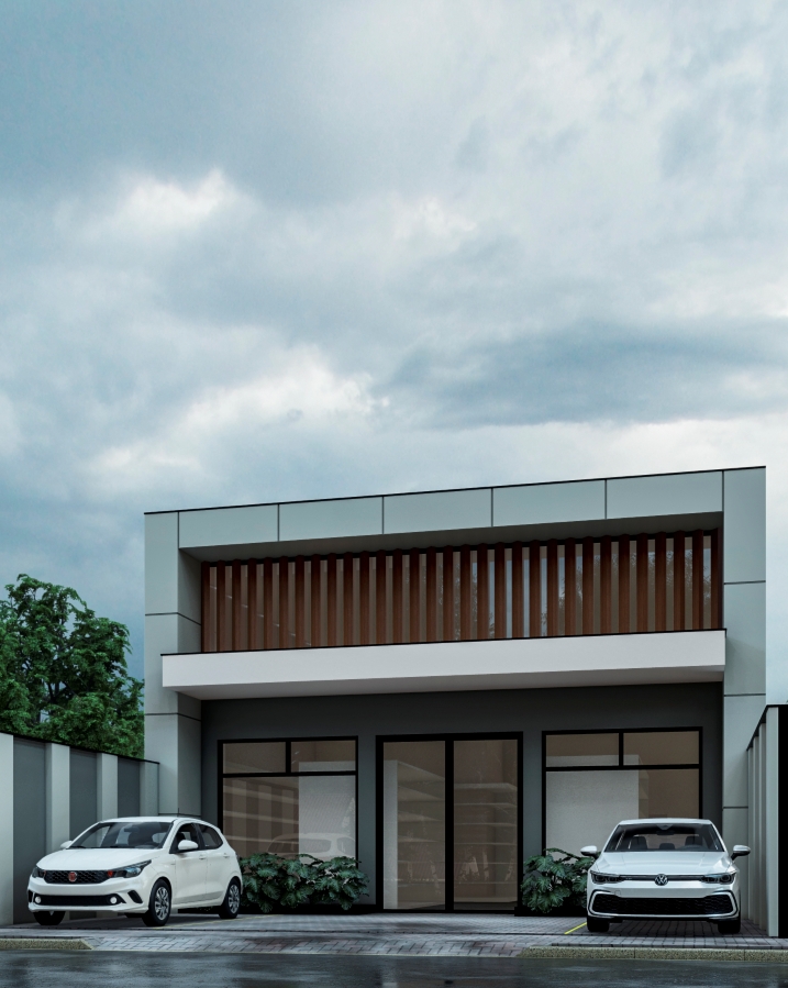 250,00m² de terreno, sendo 202,65m² de construção. Este projeto de salão comercial equilibra a necessidade de visibilidade com uma estética contemporânea e convidativa. O destaque está no jogo de planos verticais e horizontais, que confere dinamismo à fachada. O uso estratégico de grandes panos de vidro maximiza a transparência e a exposição interna — essenciais para o uso comercial — ao mesmo tempo que garante iluminação natural abundante. Um brise em madeira foi incorporado ao design, adicionando textura e funcionando como filtro solar, sem bloquear completamente a entrada de luz.