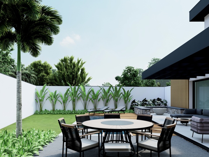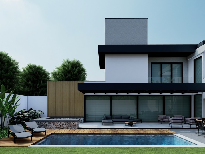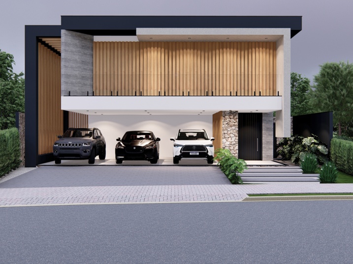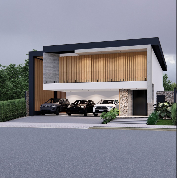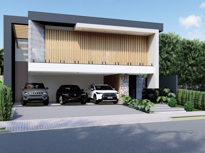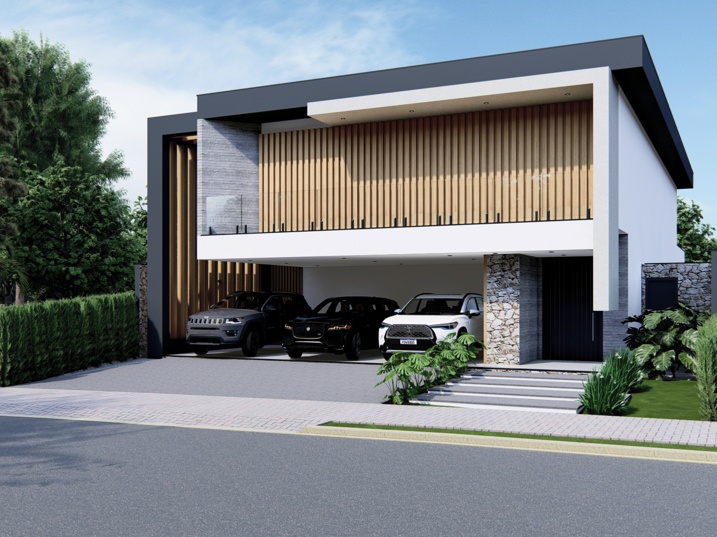 500,00m² de terreno, sendo 295,85m² de construção. Esta residência é um estudo em geometria e contraste, explorando volumes puros para criar uma arquitetura imponente e sofisticada. O projeto valoriza a vida ao ar livre e a integração entre os espaços internos e externos. A composição utiliza o branco liso como base, em contraste com o tom escuro (grafite ou preto) das lajes de cobertura e a textura orgânica do revestimento amadeirado vertical. O painel de madeira atua como brise no pavimento superior, controlando a entrada de luz solar e garantindo privacidade aos ambientes íntimos. Elementos em concreto aparente e detalhes em pedra rústica reforçam a sensação de solidez e acrescentam um toque natural à composição. A piscina retangular, emoldurada por um deck de madeira que se estende pela área de estar, cria uma superfície contínua, acolhedora e perfeita para momentos de lazer e contemplação.