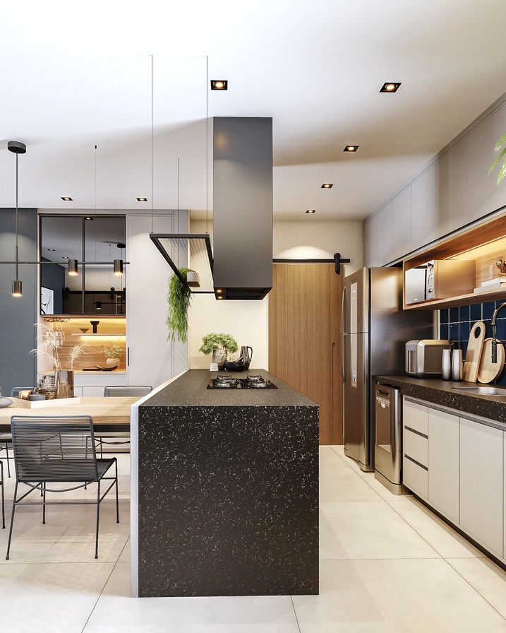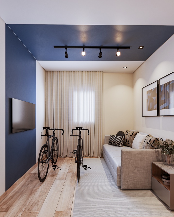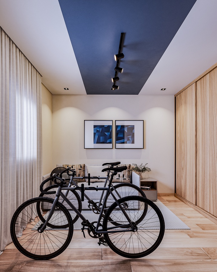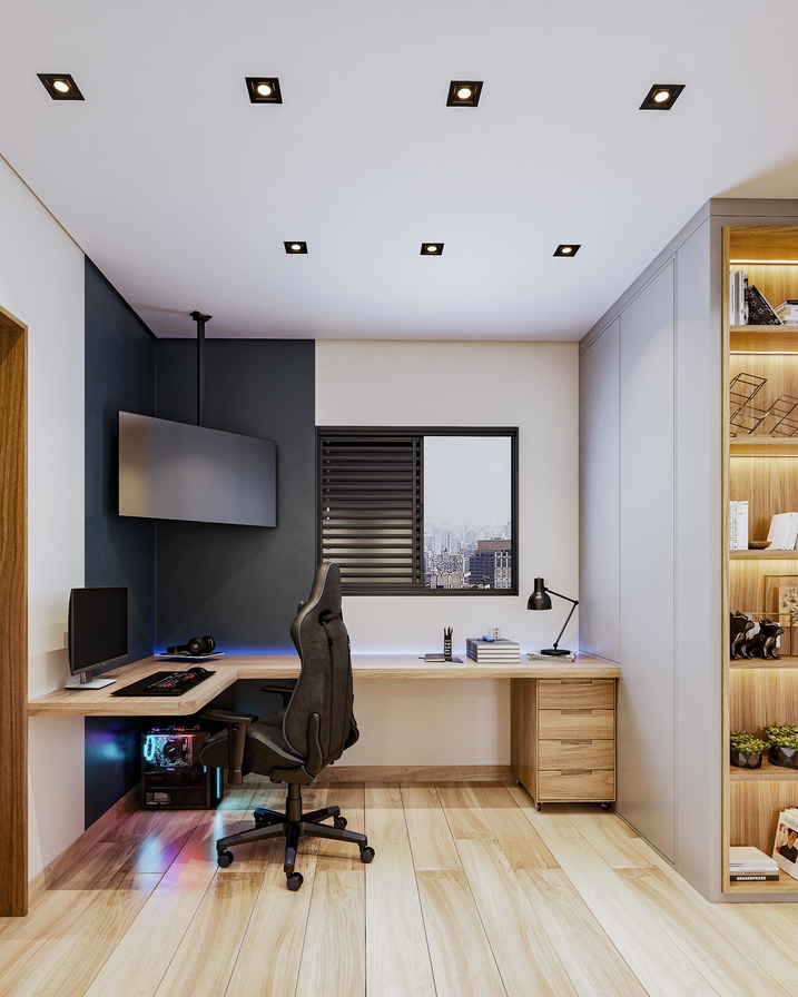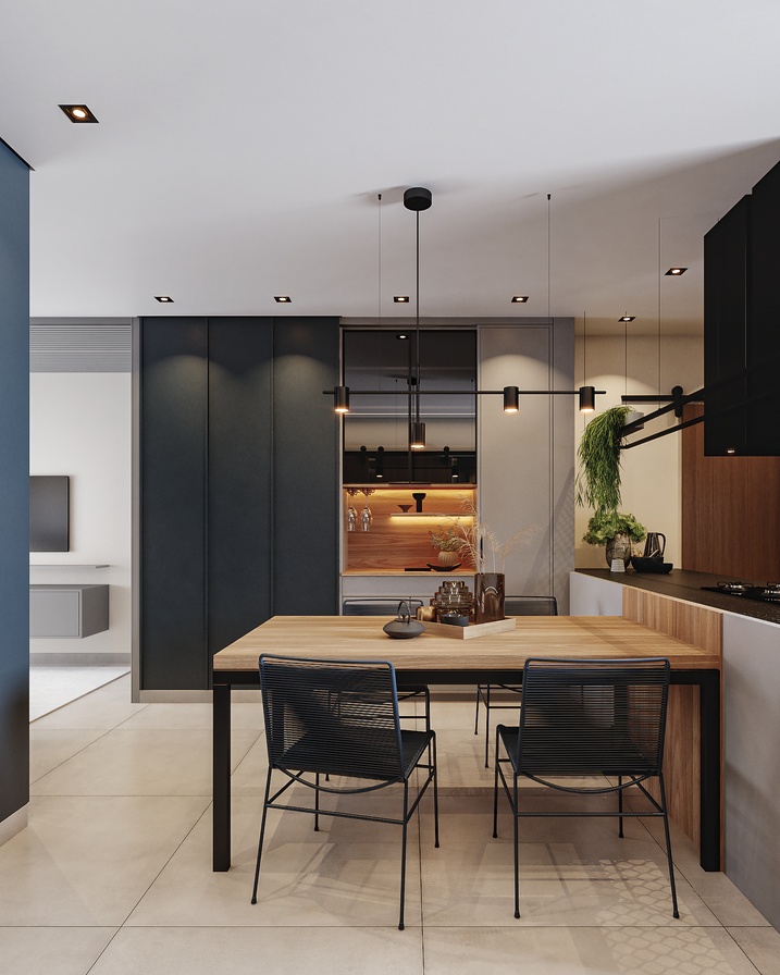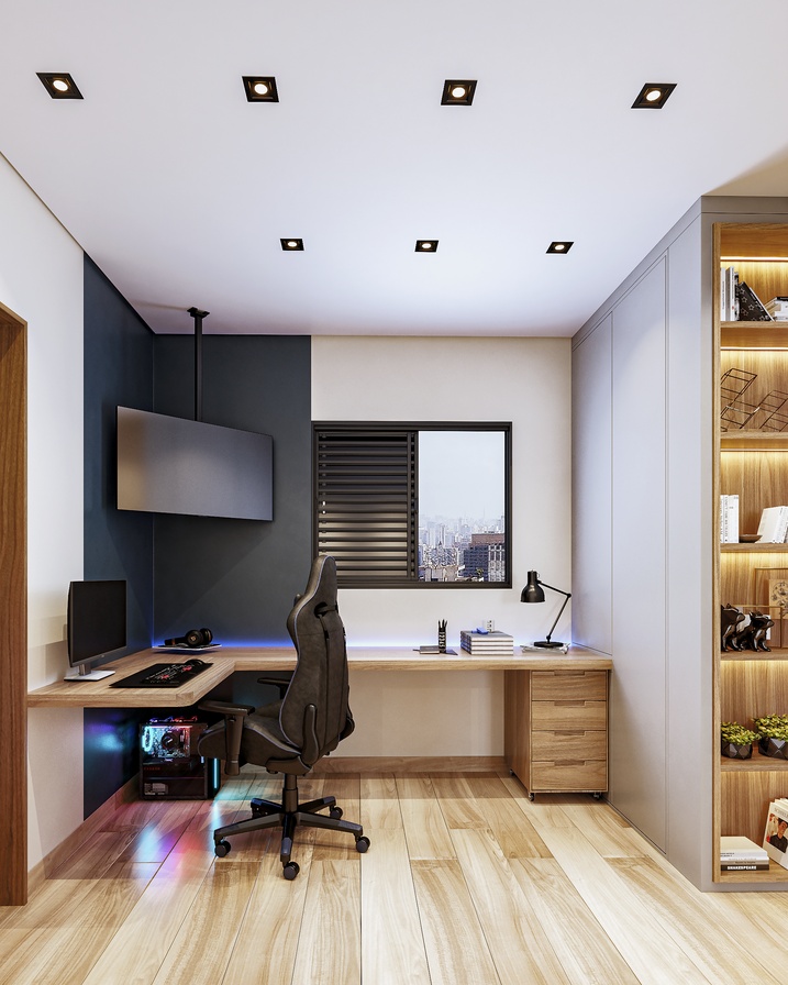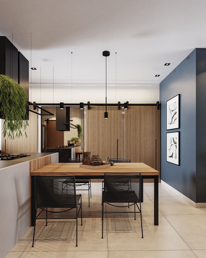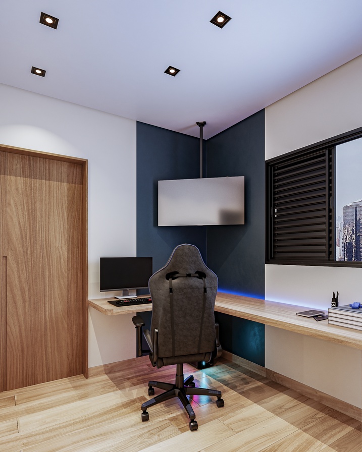 95,28m². Apartamento com personalidade, incluindo tons de azul marinho na paleta de cores. Trabalho em home office, então foi pedido um escritório amplo mas com detalhes no estilo gamer para os momentos de lazer. A área social foi pensada em trazer elementos industriais, com metais no preto.