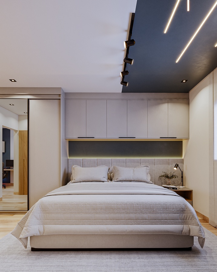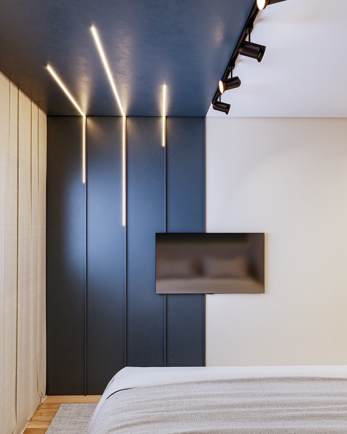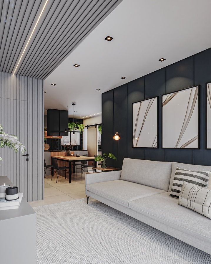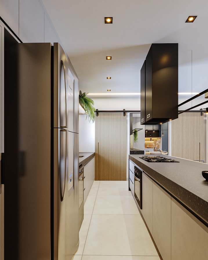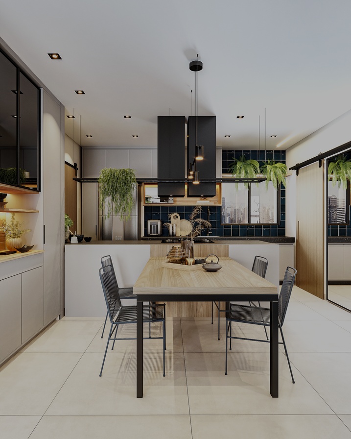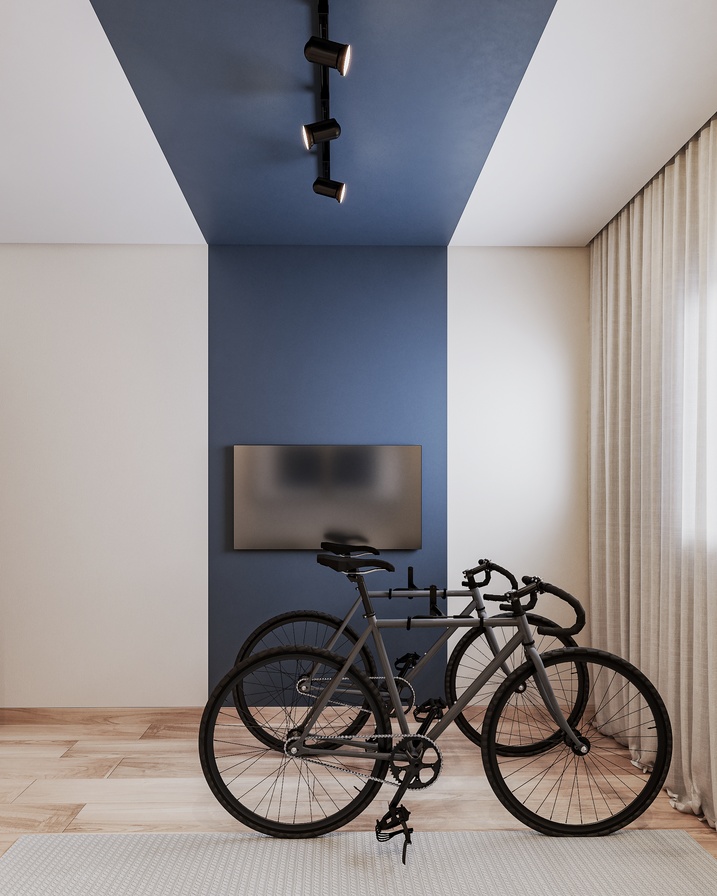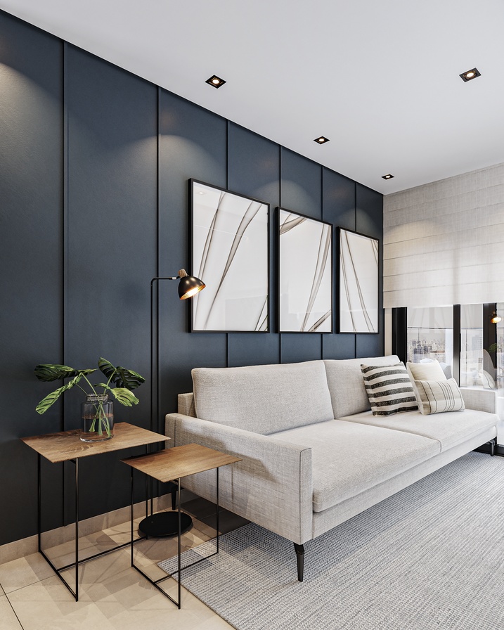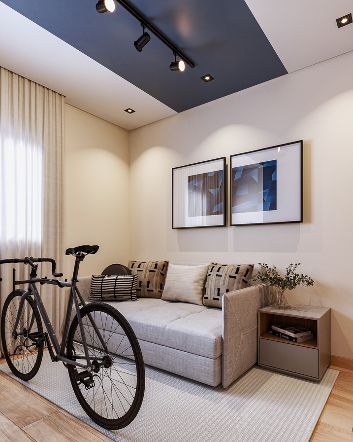 95,28m². Apartamento com personalidade, incluindo tons de azul marinho na paleta de cores. Trabalho em home office, então foi pedido um escritório amplo mas com detalhes no estilo gamer para os momentos de lazer. A área social foi pensada em trazer elementos industriais, com metais no preto.