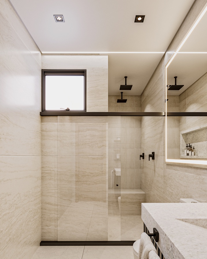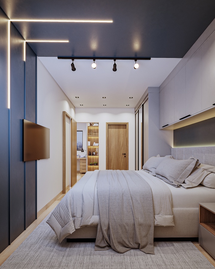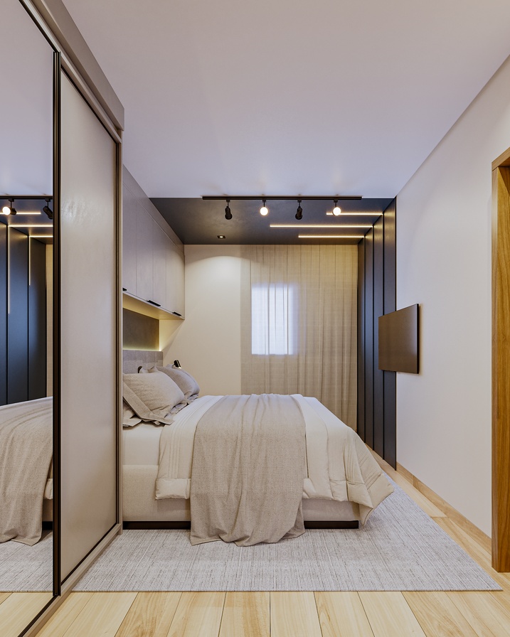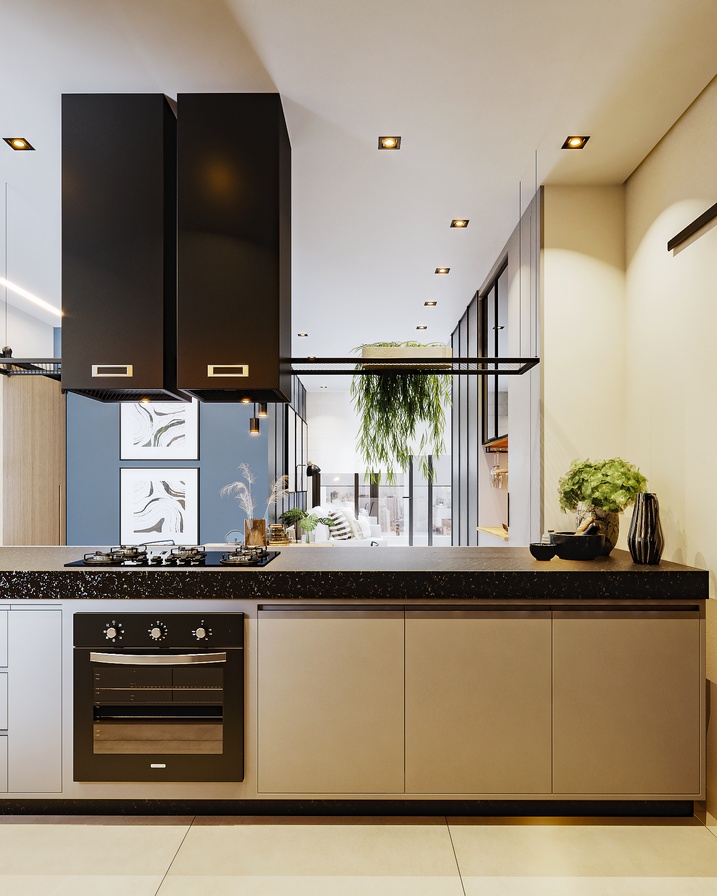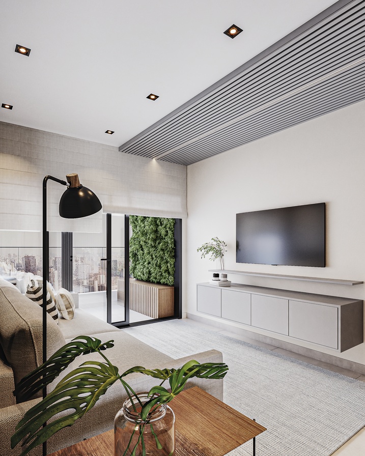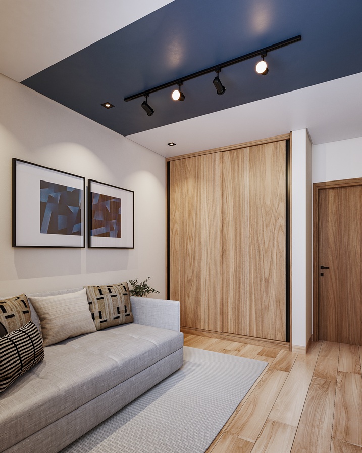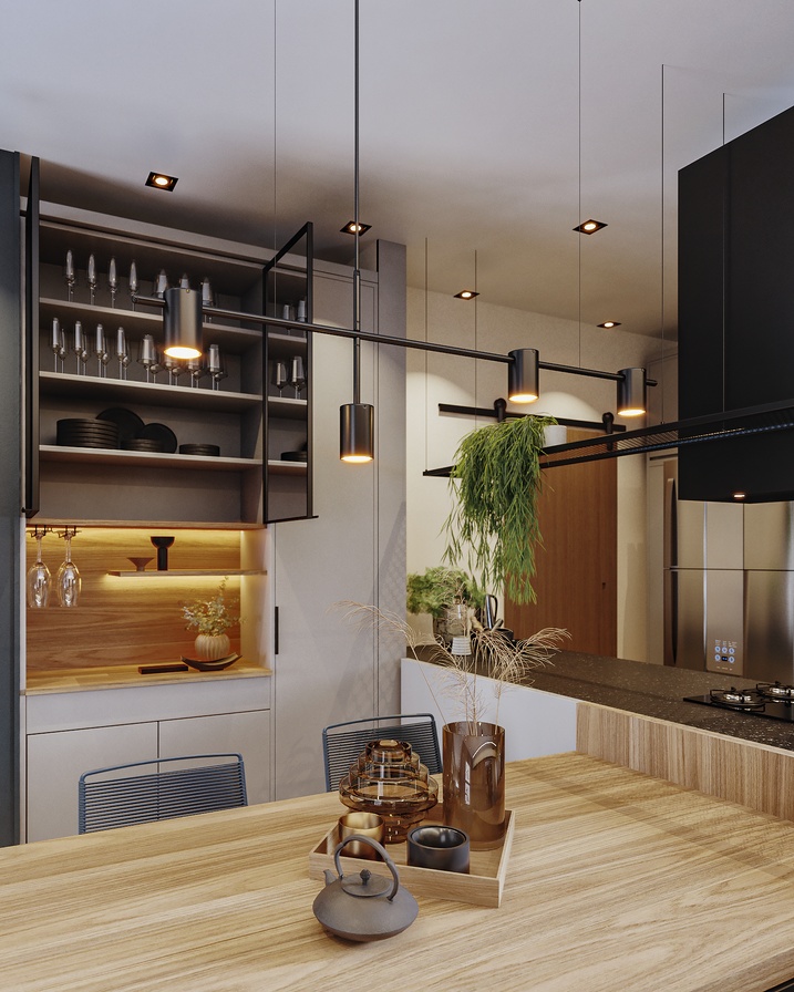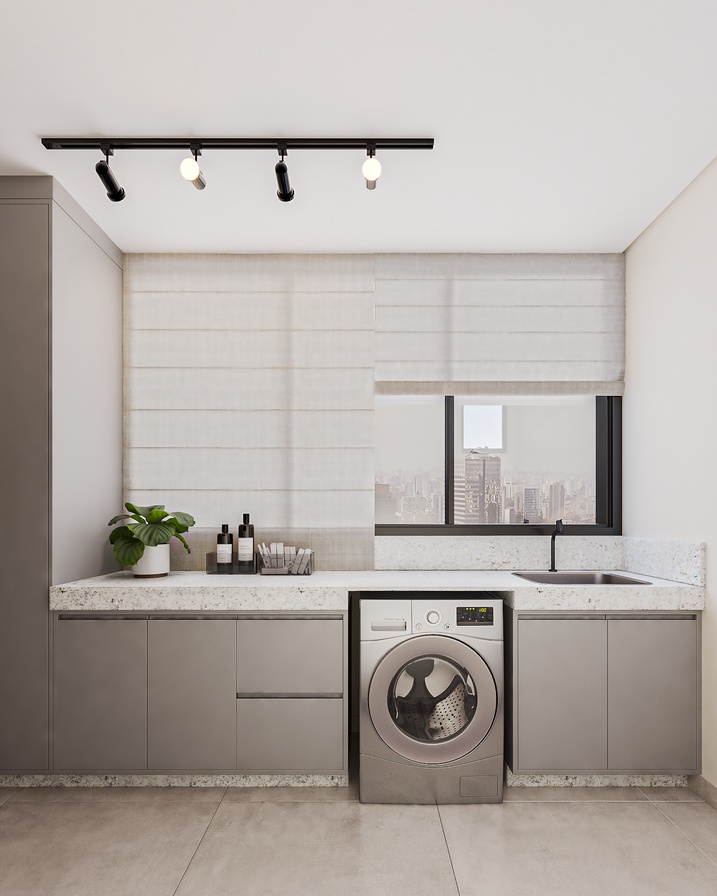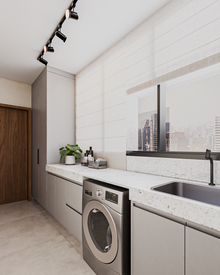 95,28m². Apartamento com personalidade, incluindo tons de azul marinho na paleta de cores. Trabalho em home office, então foi pedido um escritório amplo mas com detalhes no estilo gamer para os momentos de lazer. A área social foi pensada em trazer elementos industriais, com metais no preto.
