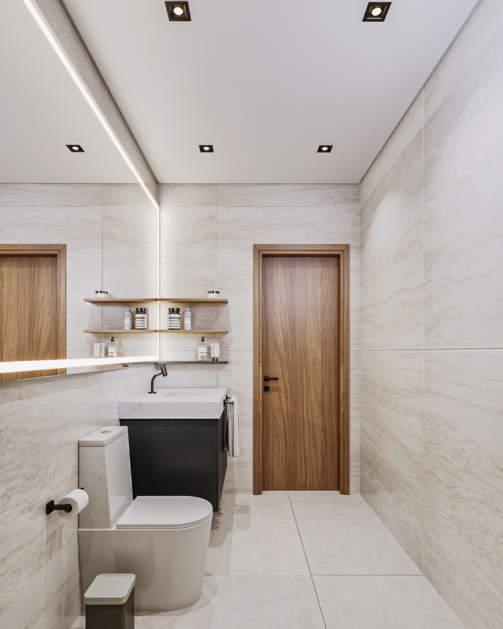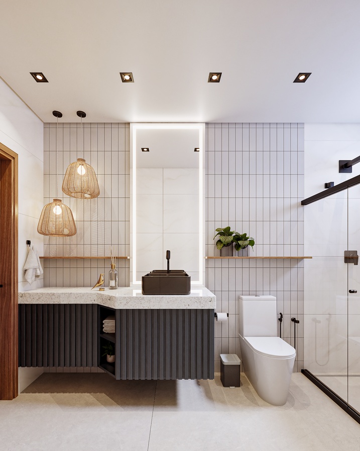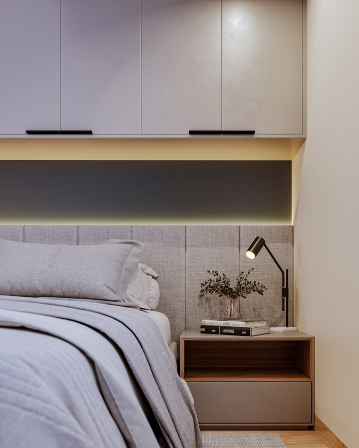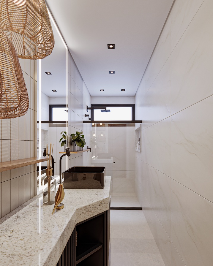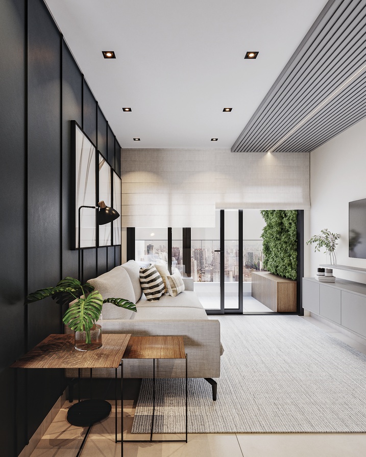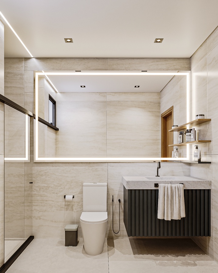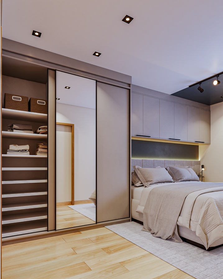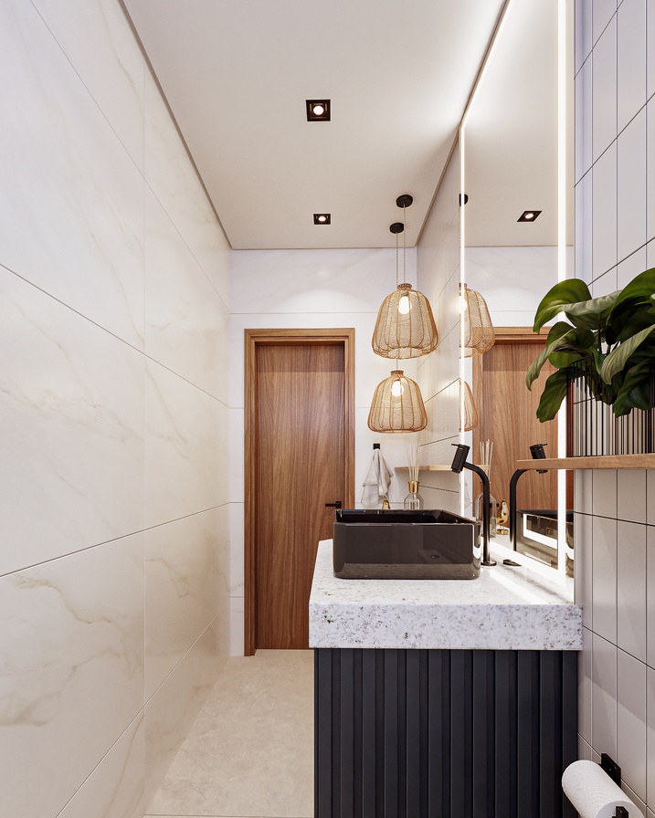 95,28m². Apartamento com personalidade, incluindo tons de azul marinho na paleta de cores. Trabalho em home office, então foi pedido um escritório amplo mas com detalhes no estilo gamer para os momentos de lazer. A área social foi pensada em trazer elementos industriais, com metais no preto.