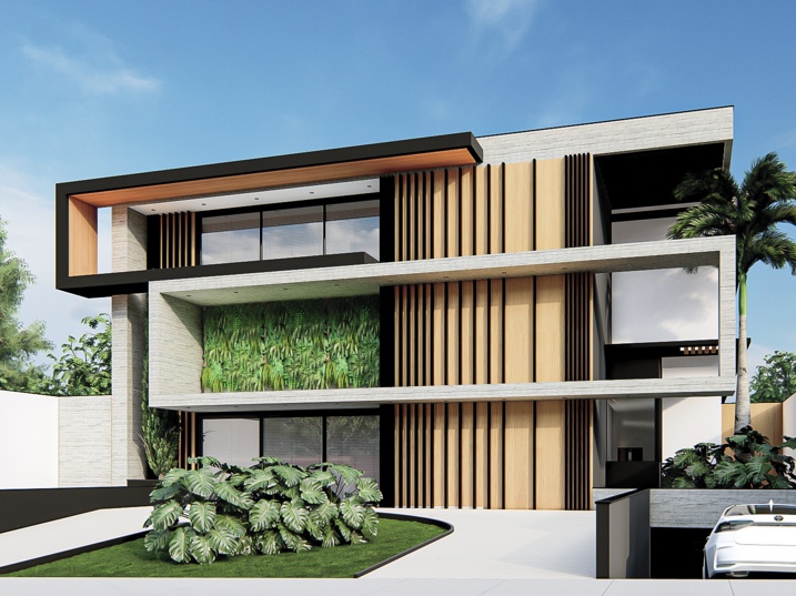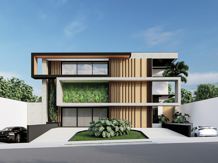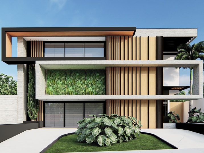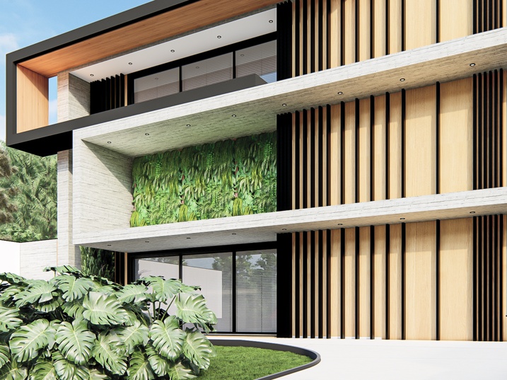 O destaque principal é o jardim vertical de grandes dimensões, localizado no volume central da fachada. Posicionado como o coração visual do edifício, ele traz leveza e sensação de tranquilidade ao conjunto. As amplas esquadrias de vidro garantem abundante iluminação natural — essencial para um ambiente de saúde —, enquanto os brises de madeira controlam a incidência solar e preservam a privacidade dos consultórios, unindo funcionalidade e estética de forma equilibrada.