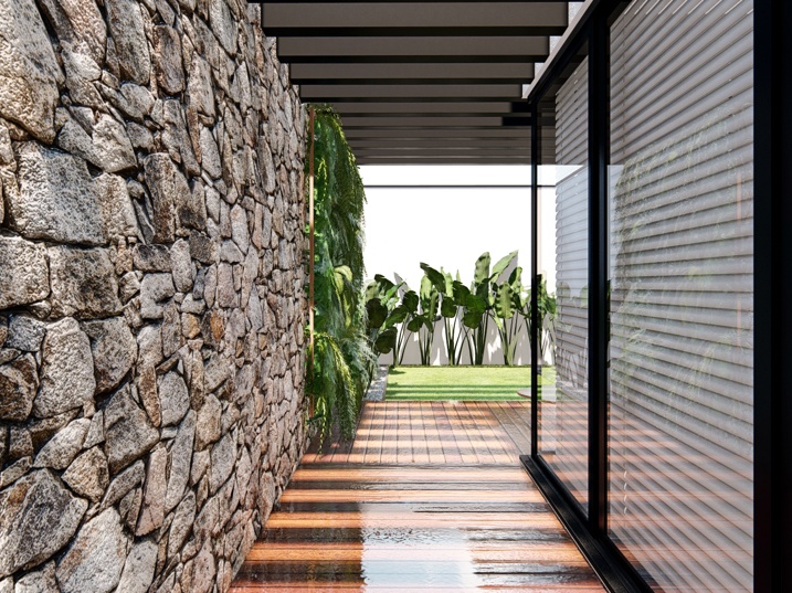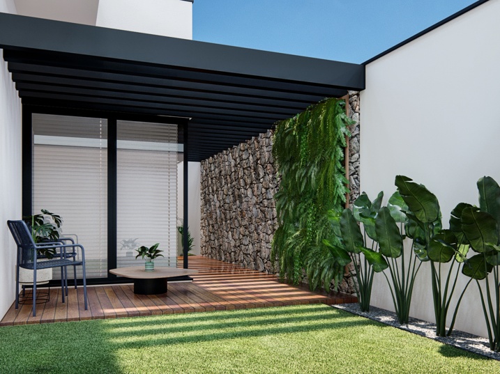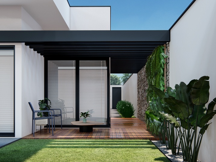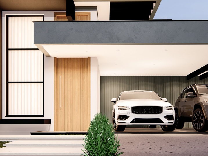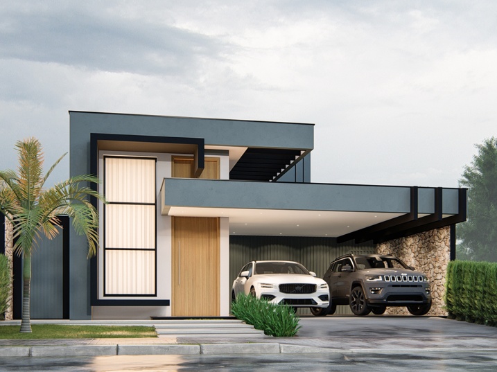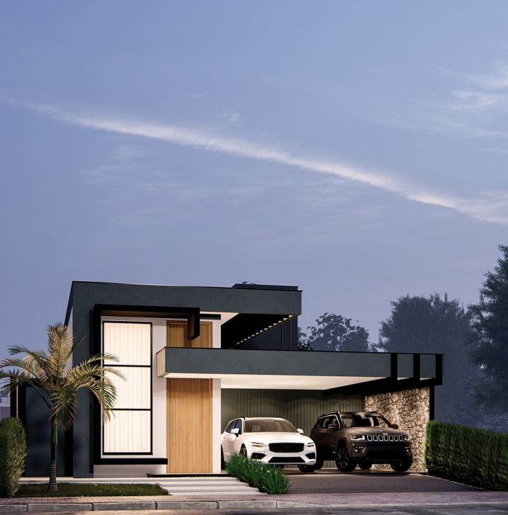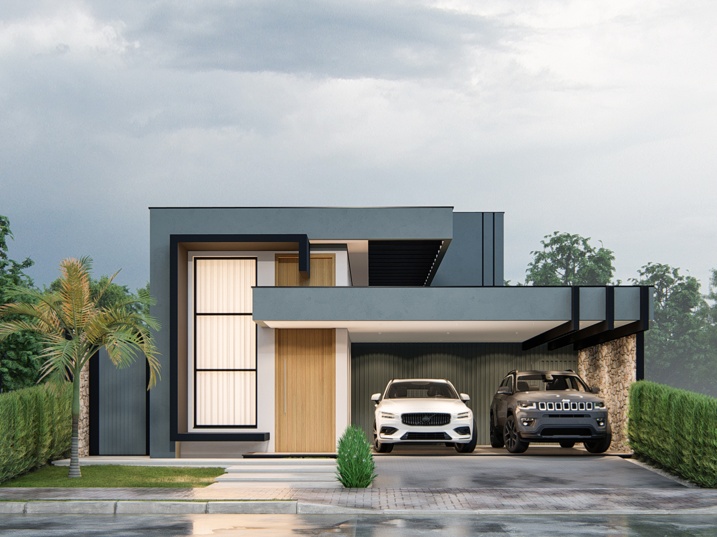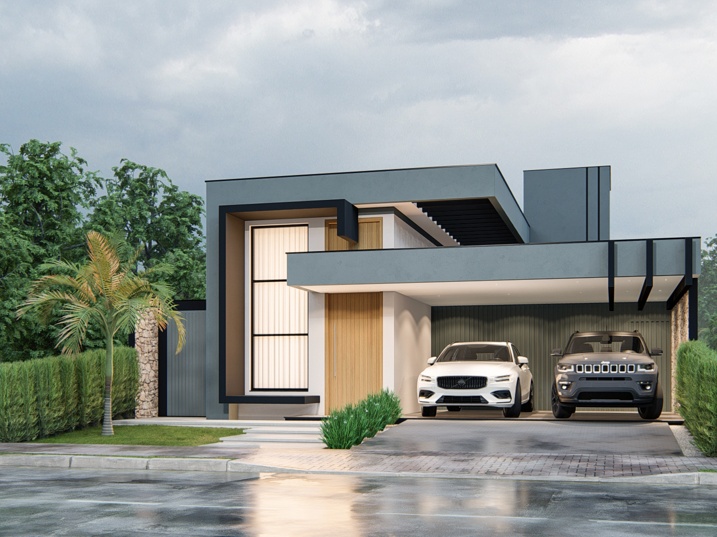 302,50m² de terreno, sendo 168,20m² de construção. Este projeto residencial de alto padrão apresenta uma arquitetura moderna e imponente, caracterizada pelo uso de volumes puros e uma paleta de cores sóbrias. A fachada foi cuidadosamente planejada para equilibrar sofisticação e acolhimento, com planos que se sobrepõem e se projetam em diferentes profundidades, criando um jogo de luz e sombra que adiciona dinamismo à composição. O volume principal, em tom grafite ou cinza chumbo, contrasta com superfícies em cinza claro, reforçando a sensação de solidez e contemporaneidade. A entrada é marcada por um pórtico de pé-direito duplo e um painel vertical de vidro ao lado da porta, que amplia a iluminação natural e destaca o acesso como ponto central do projeto.