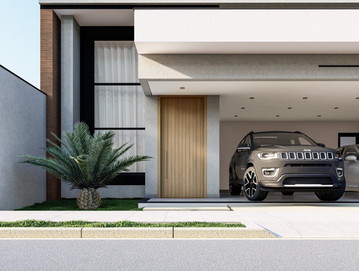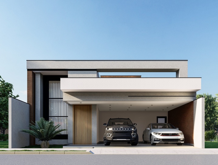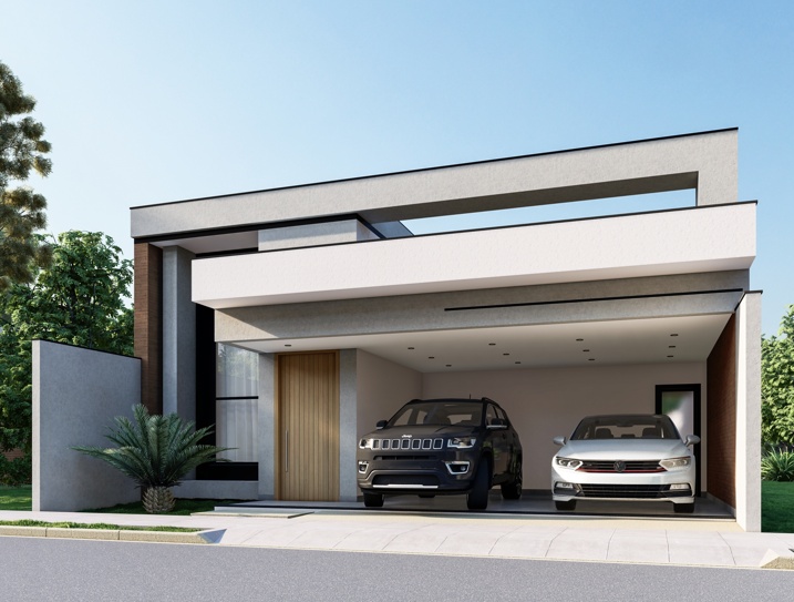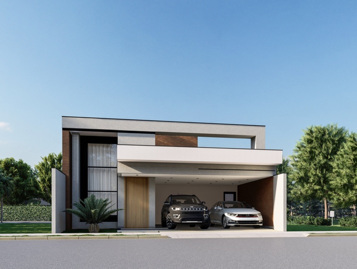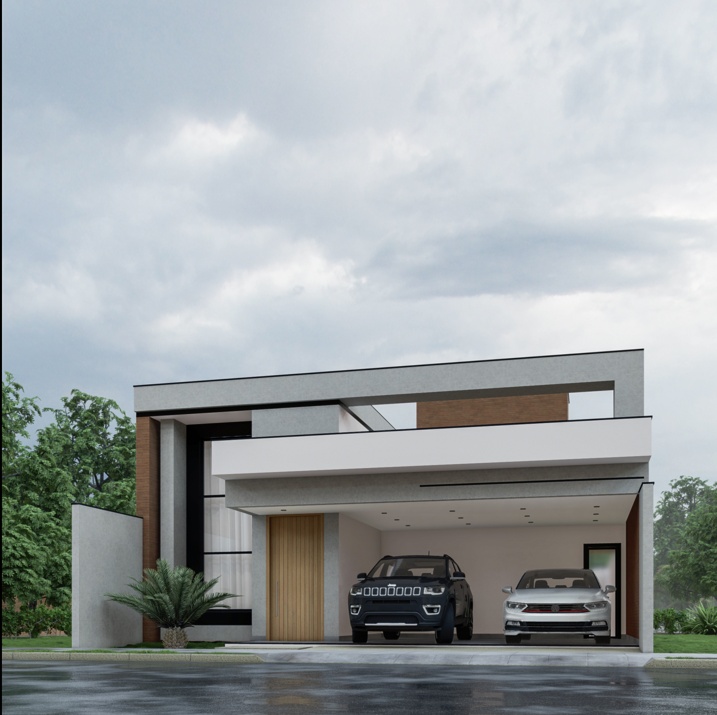 250,00m² de terreno, sendo 168,27m² de construção. A fachada se distingue pelo jogo de contrastes entre o branco liso das paredes e das lajes e as texturas naturais. O uso de painéis em tijolo aparente rústico nas laterais confere detalhe de cor e dimensão, balanceando a frieza do concreto e do vidro. A abertura de pé-direito duplo é essencial para a iluminação zenital e a ventilação do interior, além de reforçar a modernidade do projeto. O paisagismo é discreto, mas estratégico, adicionando um toque natural e verticalidade para contrapor a horizontalidade da edificação.