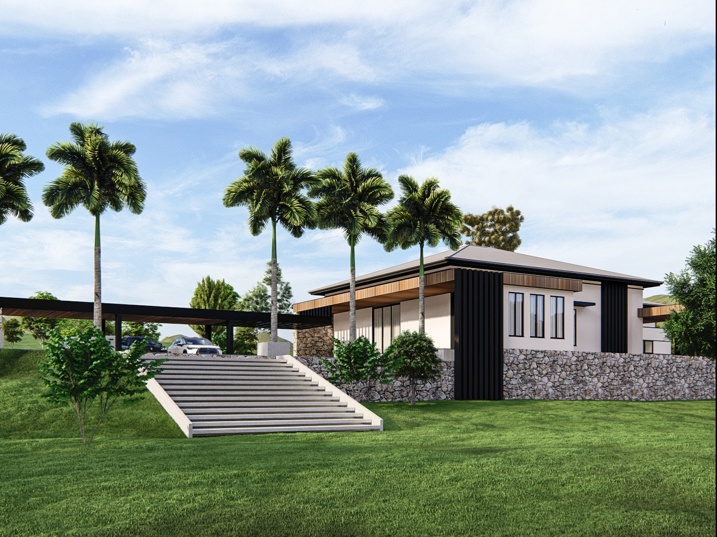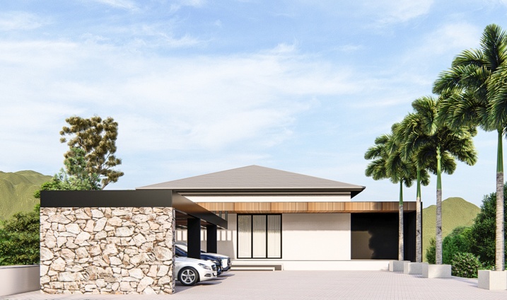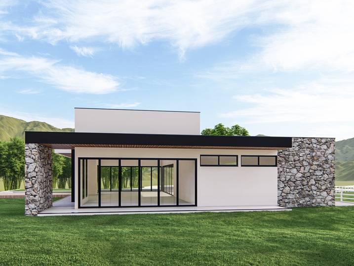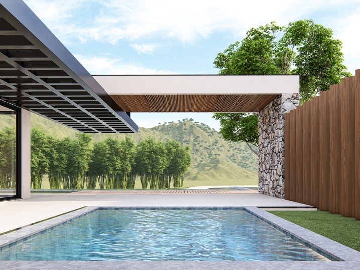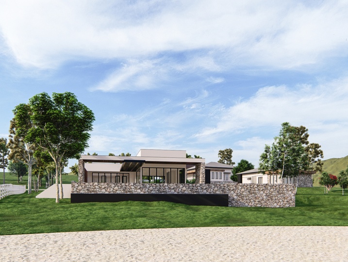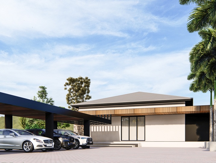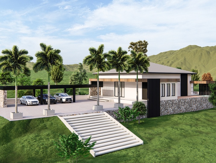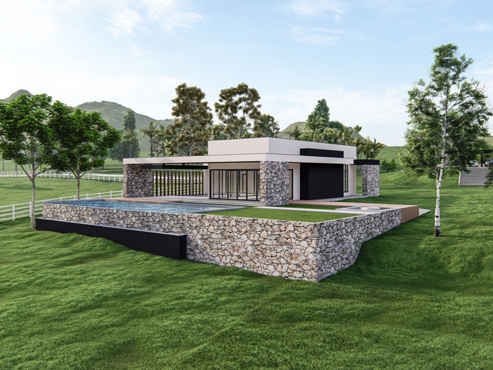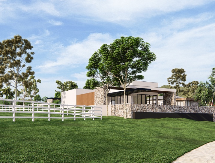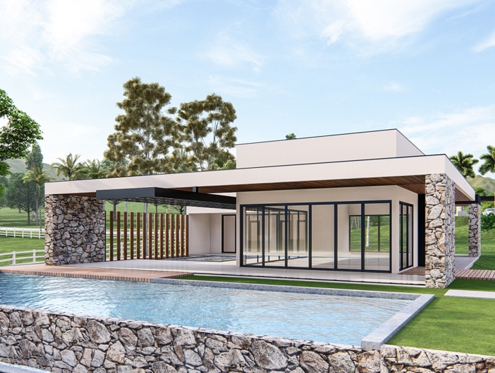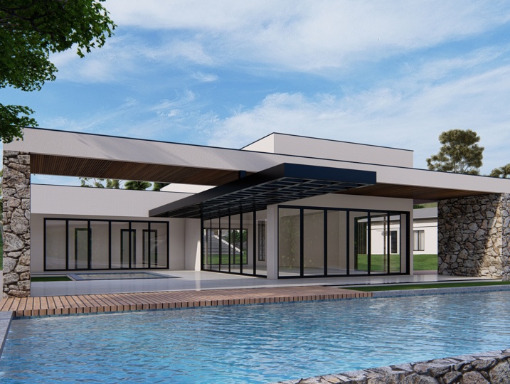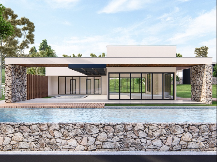 275,00m² de terreno, sendo 167,85m² de construção. Este projeto de fazenda é uma fusão entre o design moderno e a estética rústica, criando um refúgio integrado à paisagem natural. O projeto maximiza a experiência do ambiente externo. As grandes aberturas de vidro transformam as áreas sociais em espaços fluidos, permitindo que a luz natural inunde o interior e que a vista panorâmica se torne parte integrante da decoração. O paisagismo, que inclui palmeiras altas e amplos gramados, reforça o clima de tranquilidade da fazenda. A piscina com borda infinita e seu deck adjacente oferecem um espaço ideal para relaxamento e convívio, emoldurado pelo muro de pedra que reforça o charme rústico. O acesso é cuidadosamente planejado, com uma escadaria imponente que valoriza a entrada principal e uma ampla garagem coberta que combina funcionalidade com o design moderno de sua estrutura metálica e forro de madeira.