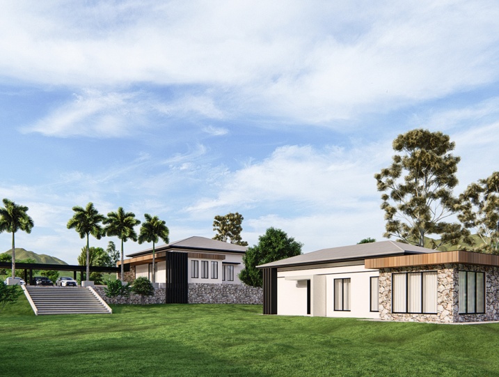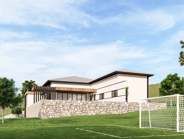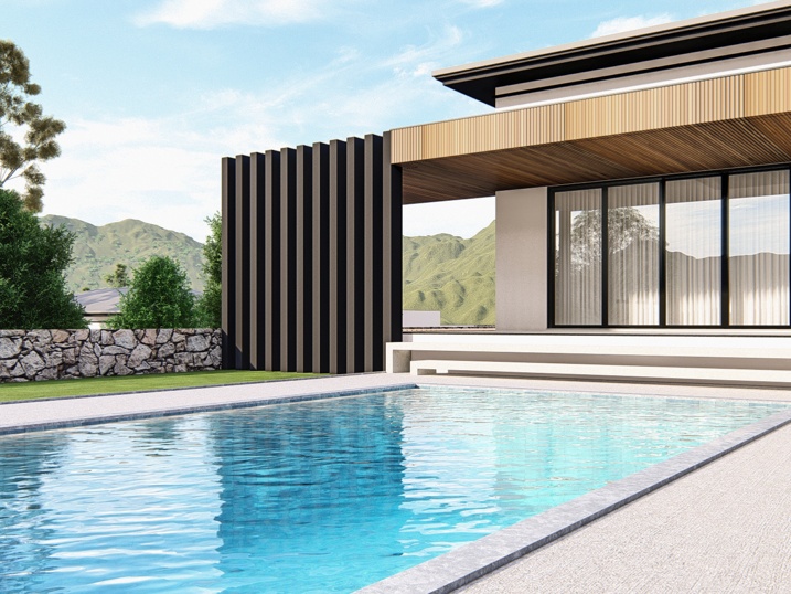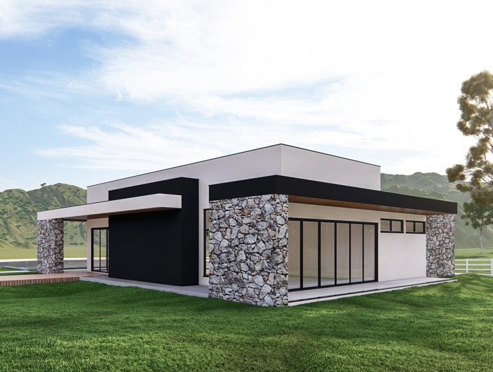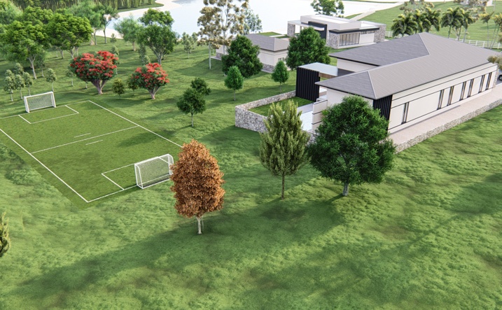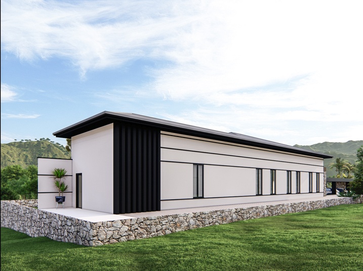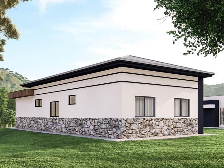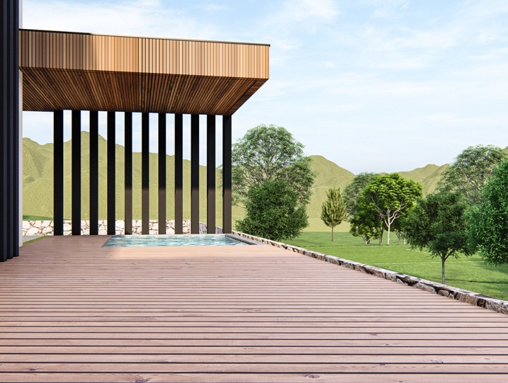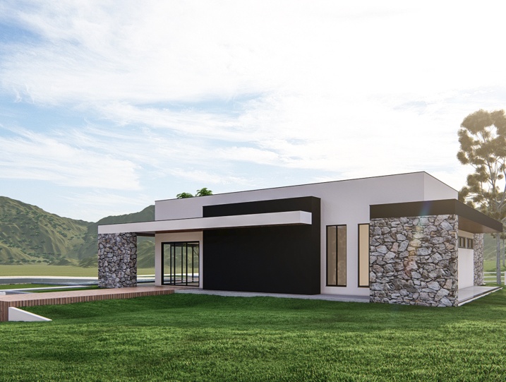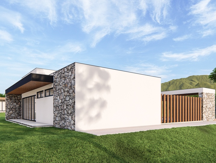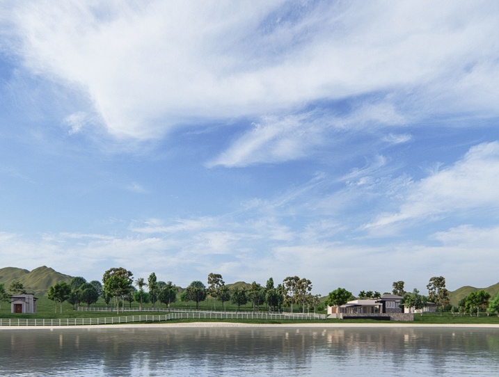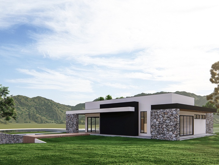275,00m² de terreno, sendo 167,85m² de construção. Este projeto de fazenda é uma fusão entre o design moderno e a estética rústica, criando um refúgio integrado à paisagem natural. O projeto maximiza a experiência do ambiente externo. As grandes aberturas de vidro transformam as áreas sociais em espaços fluidos, permitindo que a luz natural inunde o interior e que a vista panorâmica se torne parte integrante da decoração. O paisagismo, que inclui palmeiras altas e amplos gramados, reforça o clima de tranquilidade da fazenda. A piscina com borda infinita e seu deck adjacente oferecem um espaço ideal para relaxamento e convívio, emoldurado pelo muro de pedra que reforça o charme rústico. O acesso é cuidadosamente planejado, com uma escadaria imponente que valoriza a entrada principal e uma ampla garagem coberta que combina funcionalidade com o design moderno de sua estrutura metálica e forro de madeira.