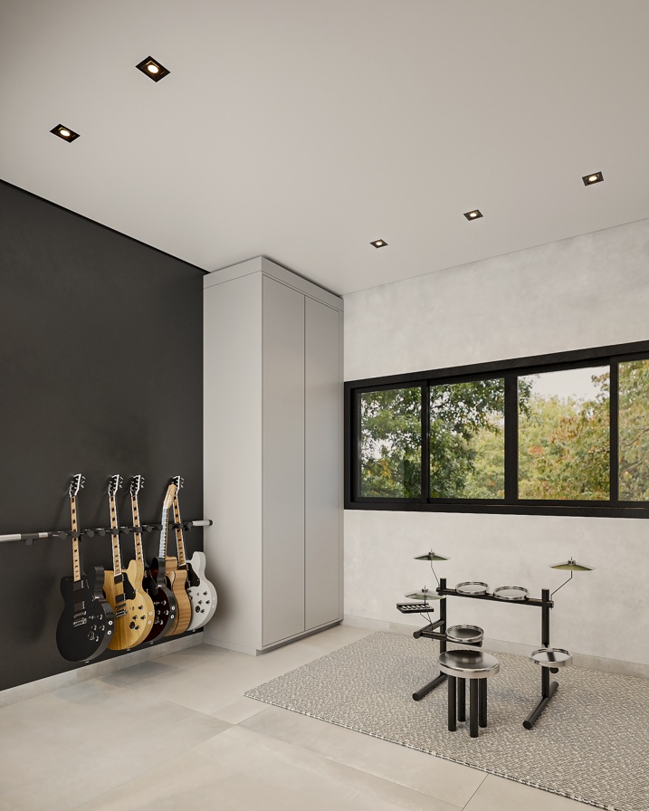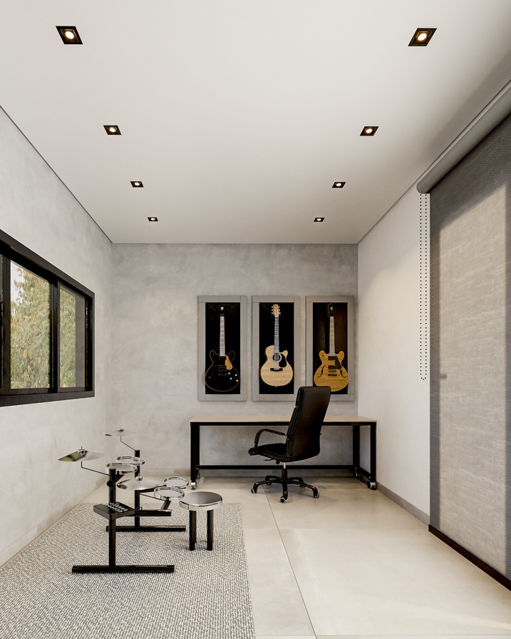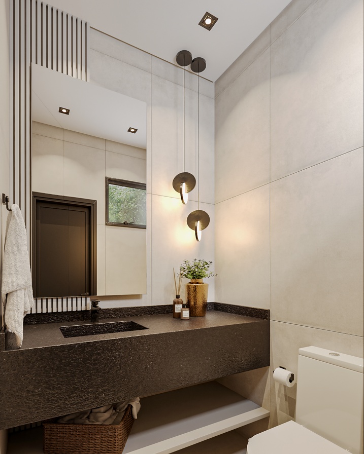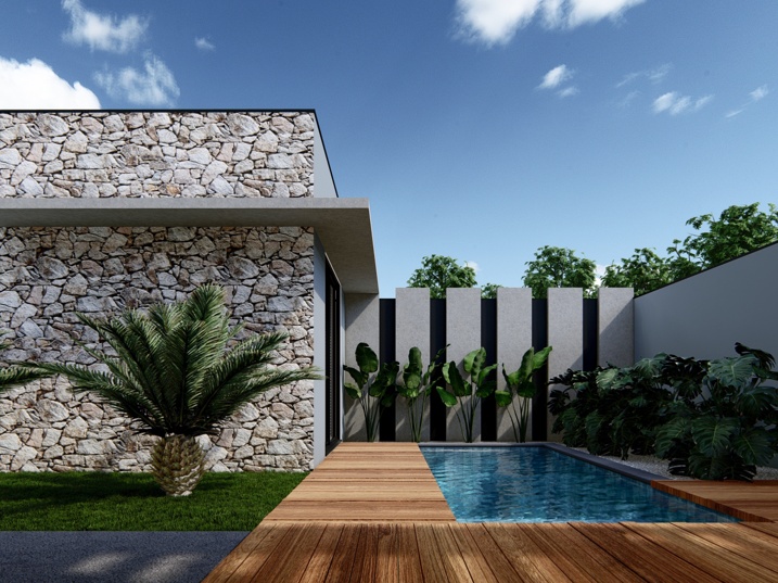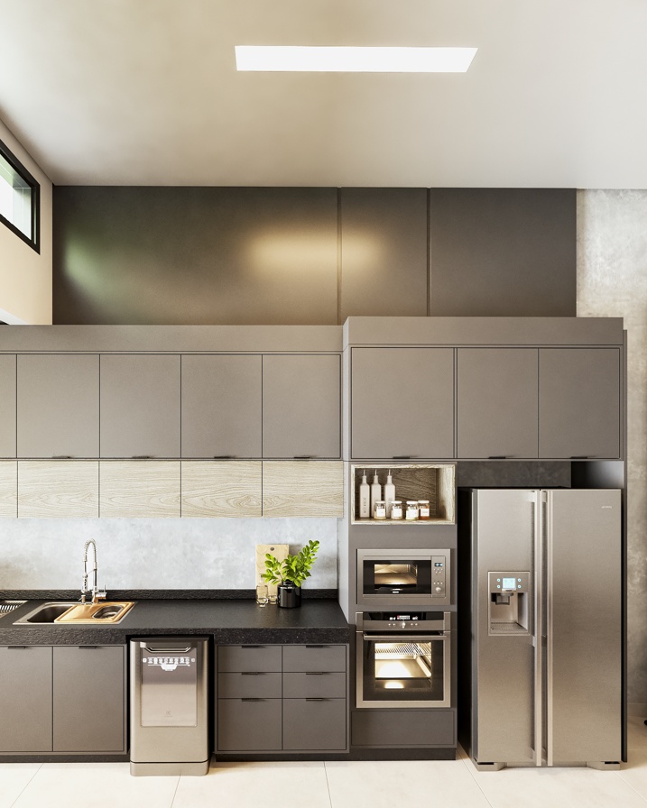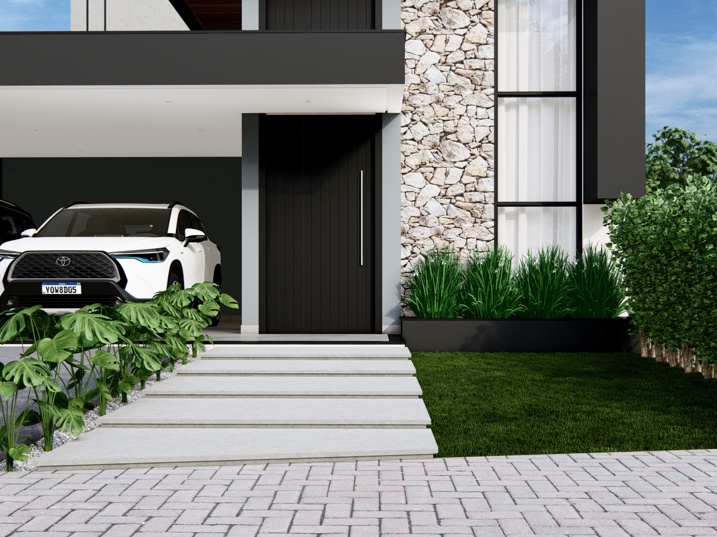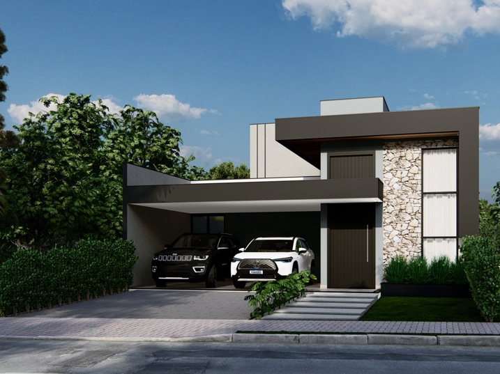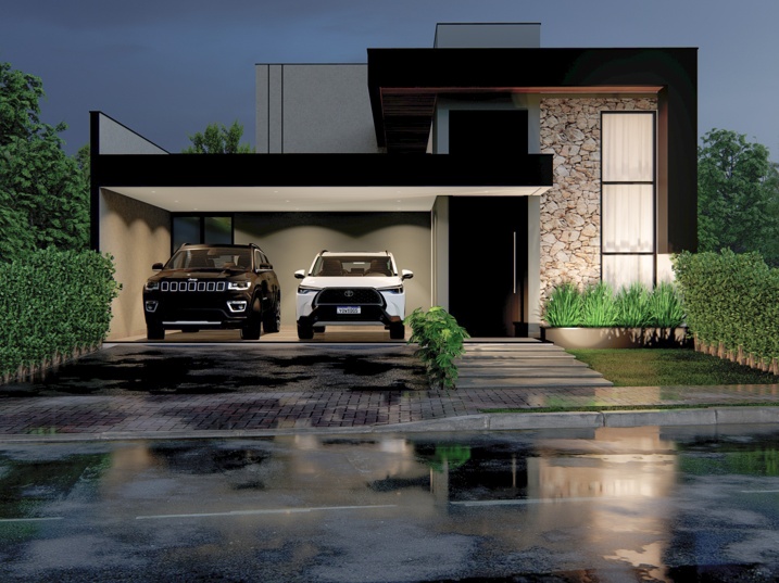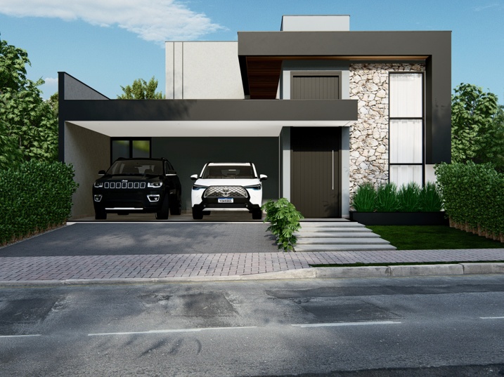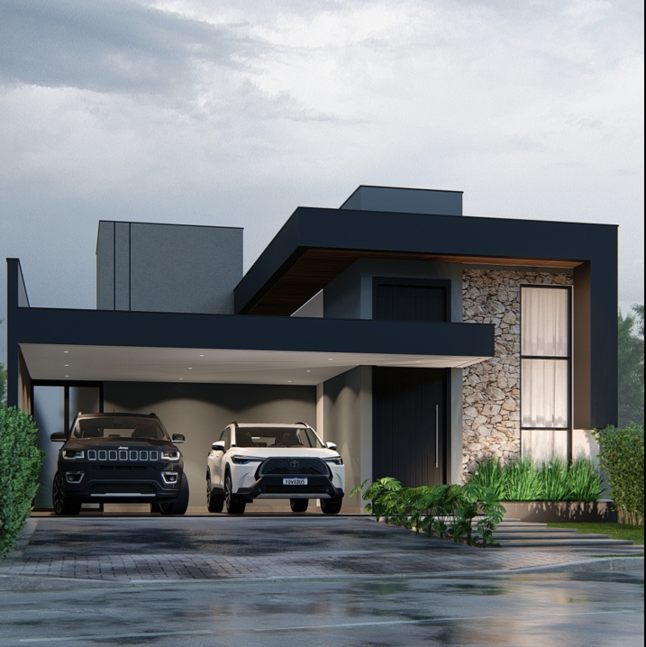 345,45m² de terreno, sendo 191,36m² de construção. A fachada frontal estabelece um visual forte e elegante. A residência exibe um design de linhas retas e volumes bem definidos, característico da arquitetura contemporânea. O contraste entre as cores escuras (como o grafite e preto) e as superfícies claras (revestimento em pedra e paredes brancas) confere profundidade e sofisticação. O revestimento em pedra rústica em parte da fachada é um destaque, adicionando textura e calor, suavizando o rigor das formas geométricas.