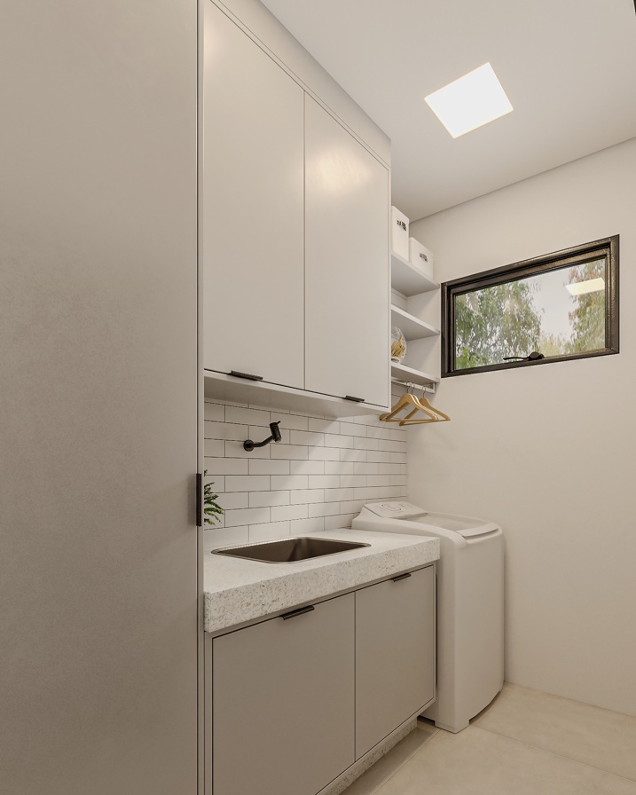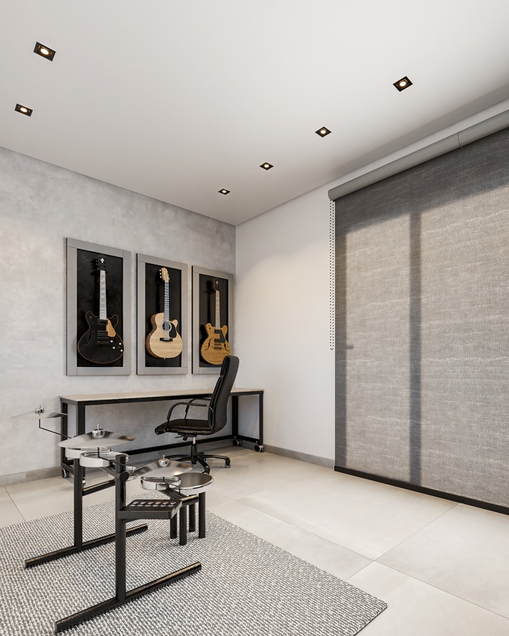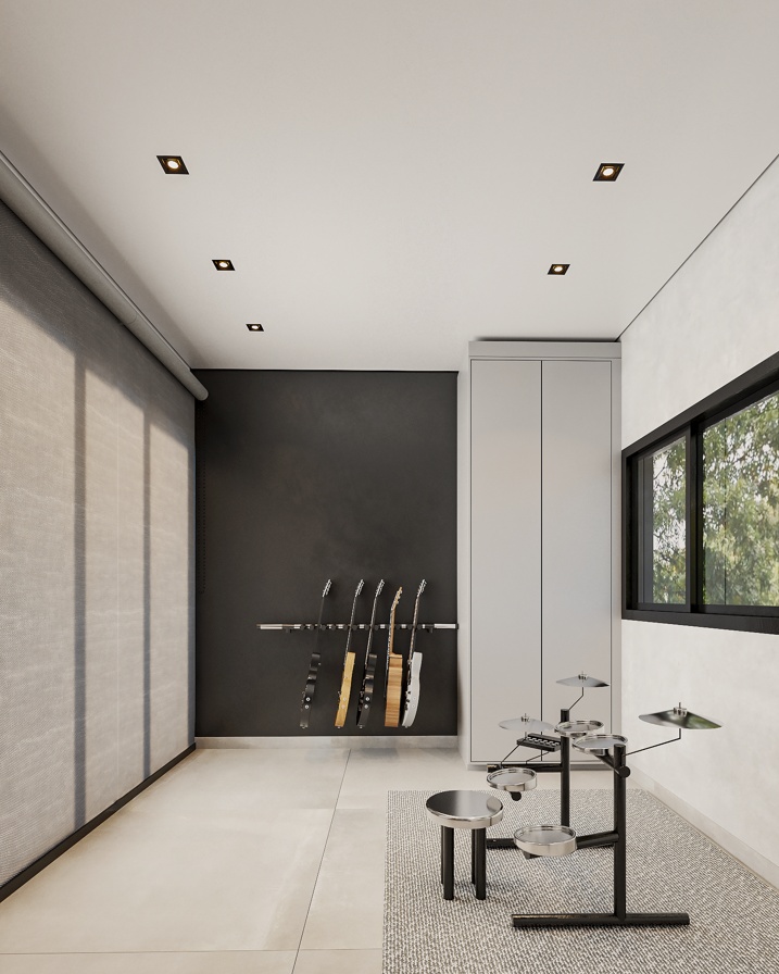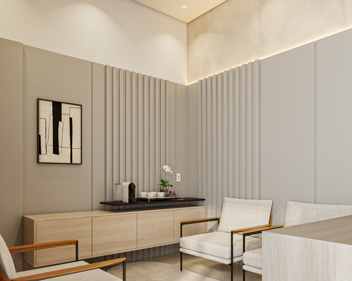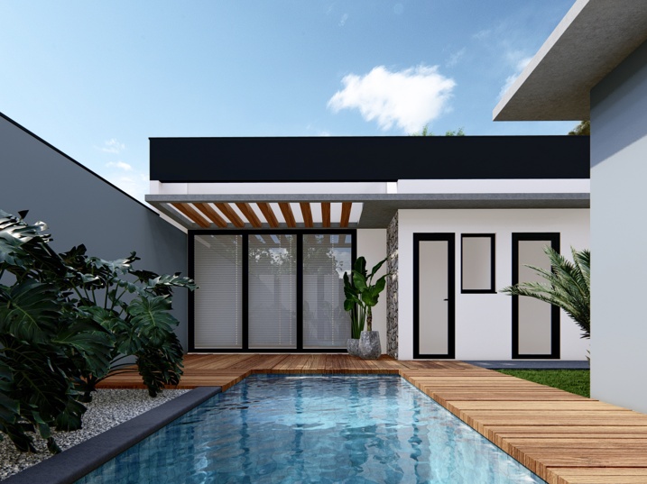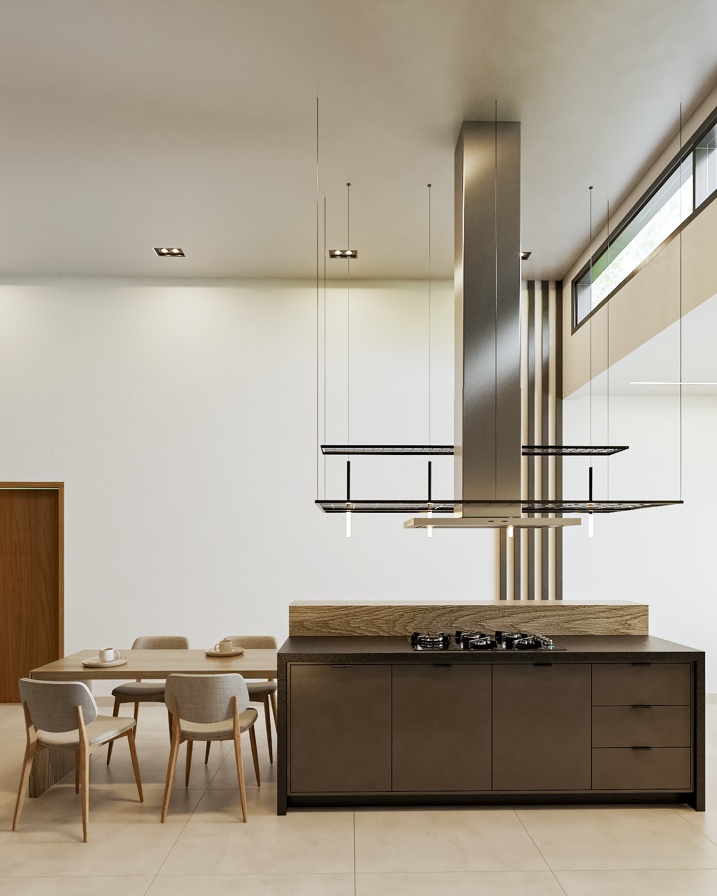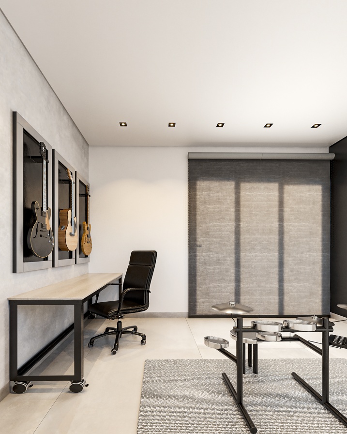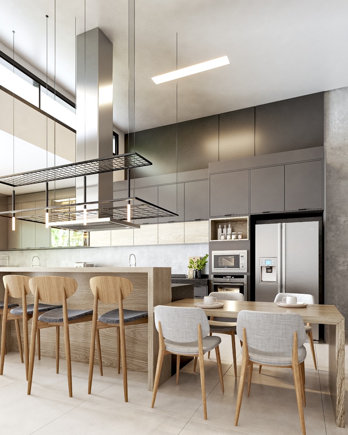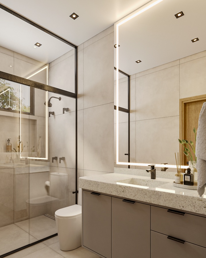 345,45m² de terreno, sendo 191,36m² de construção. A fachada frontal estabelece um visual forte e elegante. A residência exibe um design de linhas retas e volumes bem definidos, característico da arquitetura contemporânea. O contraste entre as cores escuras (como o grafite e preto) e as superfícies claras (revestimento em pedra e paredes brancas) confere profundidade e sofisticação. O revestimento em pedra rústica em parte da fachada é um destaque, adicionando textura e calor, suavizando o rigor das formas geométricas.