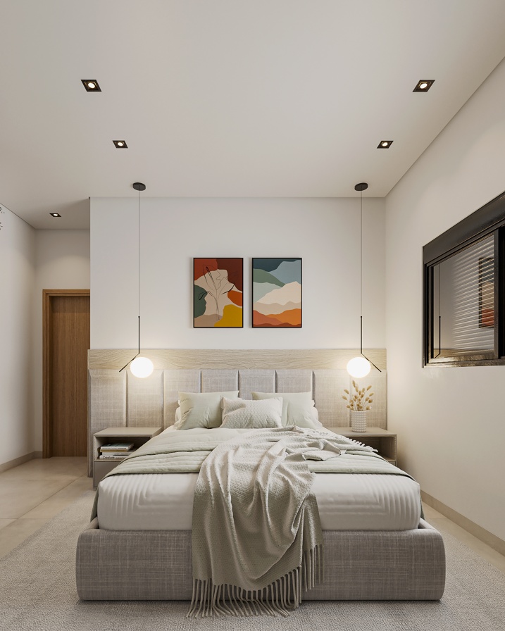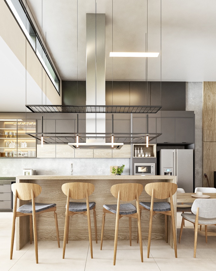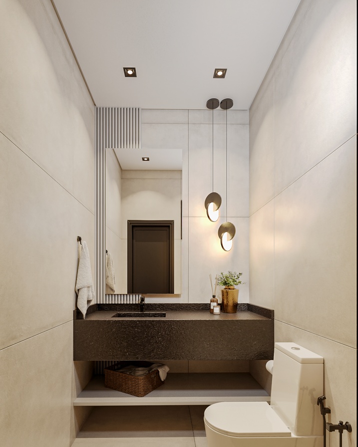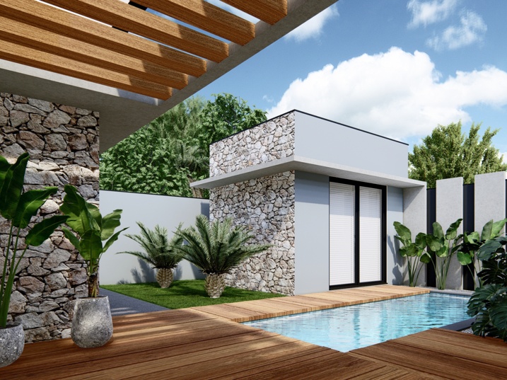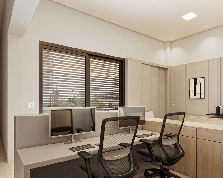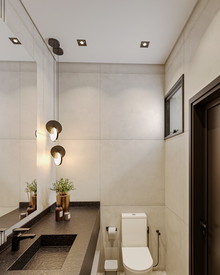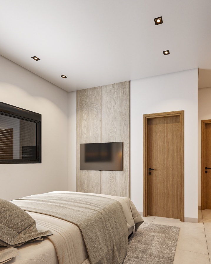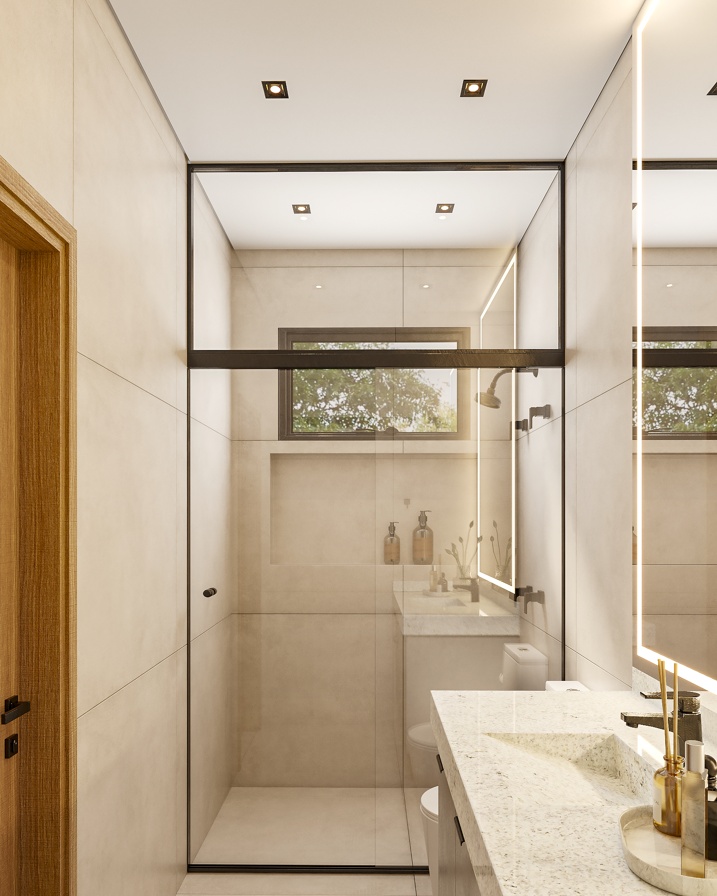 345,45m² de terreno, sendo 191,36m² de construção. A fachada frontal estabelece um visual forte e elegante. A residência exibe um design de linhas retas e volumes bem definidos, característico da arquitetura contemporânea. O contraste entre as cores escuras (como o grafite e preto) e as superfícies claras (revestimento em pedra e paredes brancas) confere profundidade e sofisticação. O revestimento em pedra rústica em parte da fachada é um destaque, adicionando textura e calor, suavizando o rigor das formas geométricas.