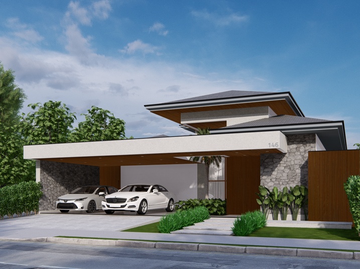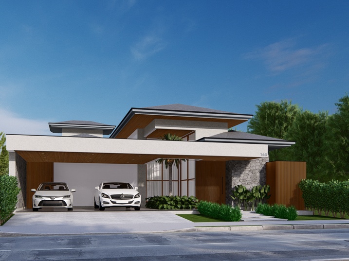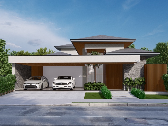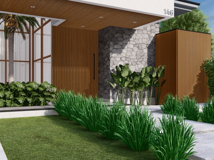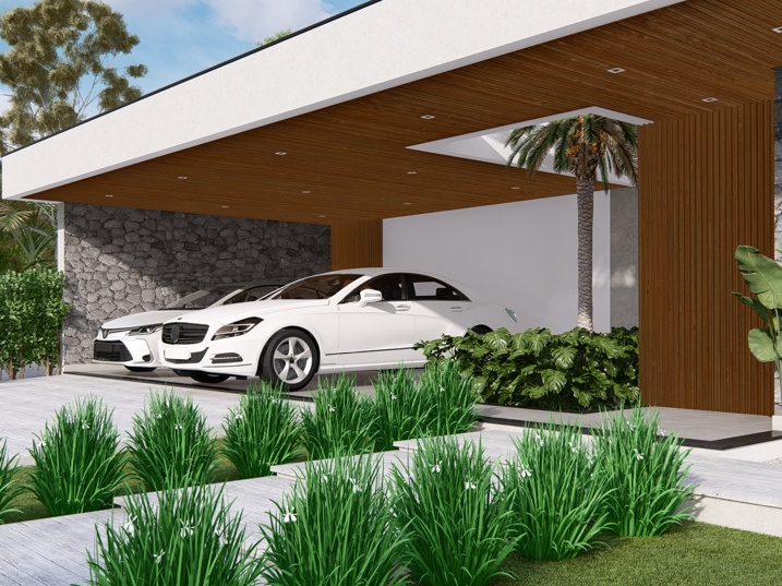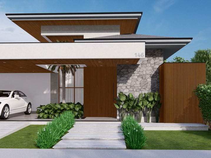 448,39m² de terreno, sendo 236,195m² de construção. A casa é marcada por uma forte horizontalidade, acentuada pela longa marquise da garagem. A cobertura em telhado aparente, porém de baixa inclinação, confere um toque de sofisticação e se contrapõe à tendência de telhados embutidos. A madeira natural adiciona calor e textura. O paisagismo complementa a arquitetura, com arbustos e plantas tropicais que suavizam as linhas da construção. A entrada social é marcada por um caminho de pedras claras e uma generosa esquadria de vidro, emoldurada pela madeira, que revela parcialmente o interior.