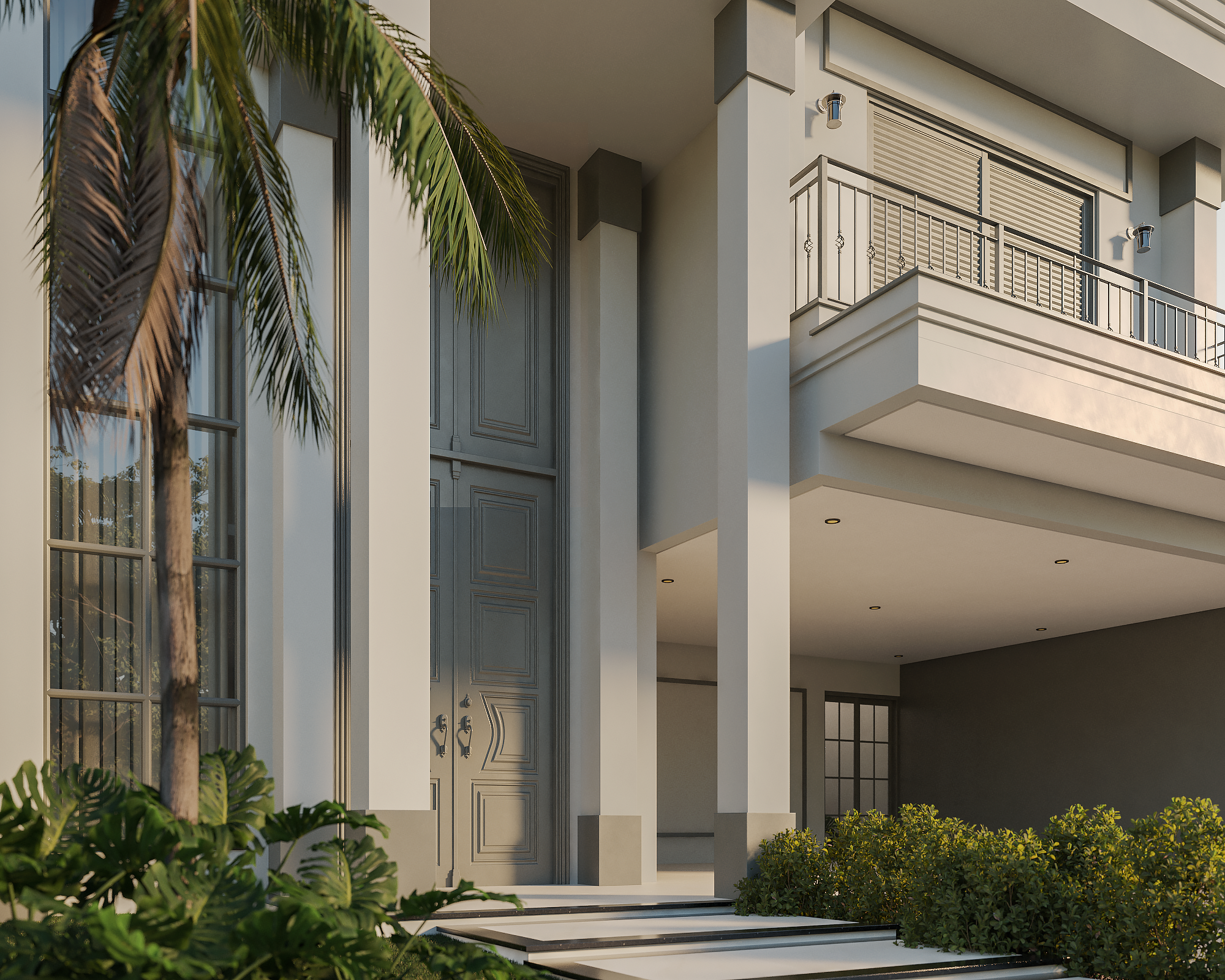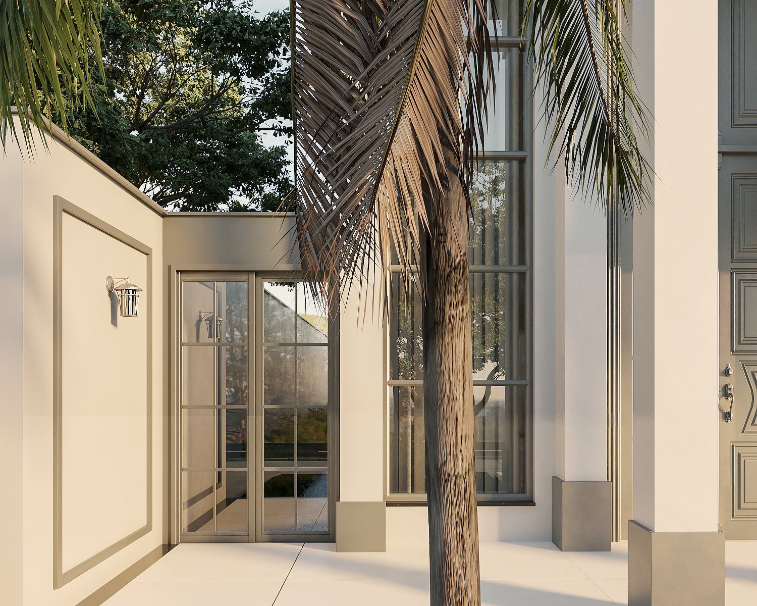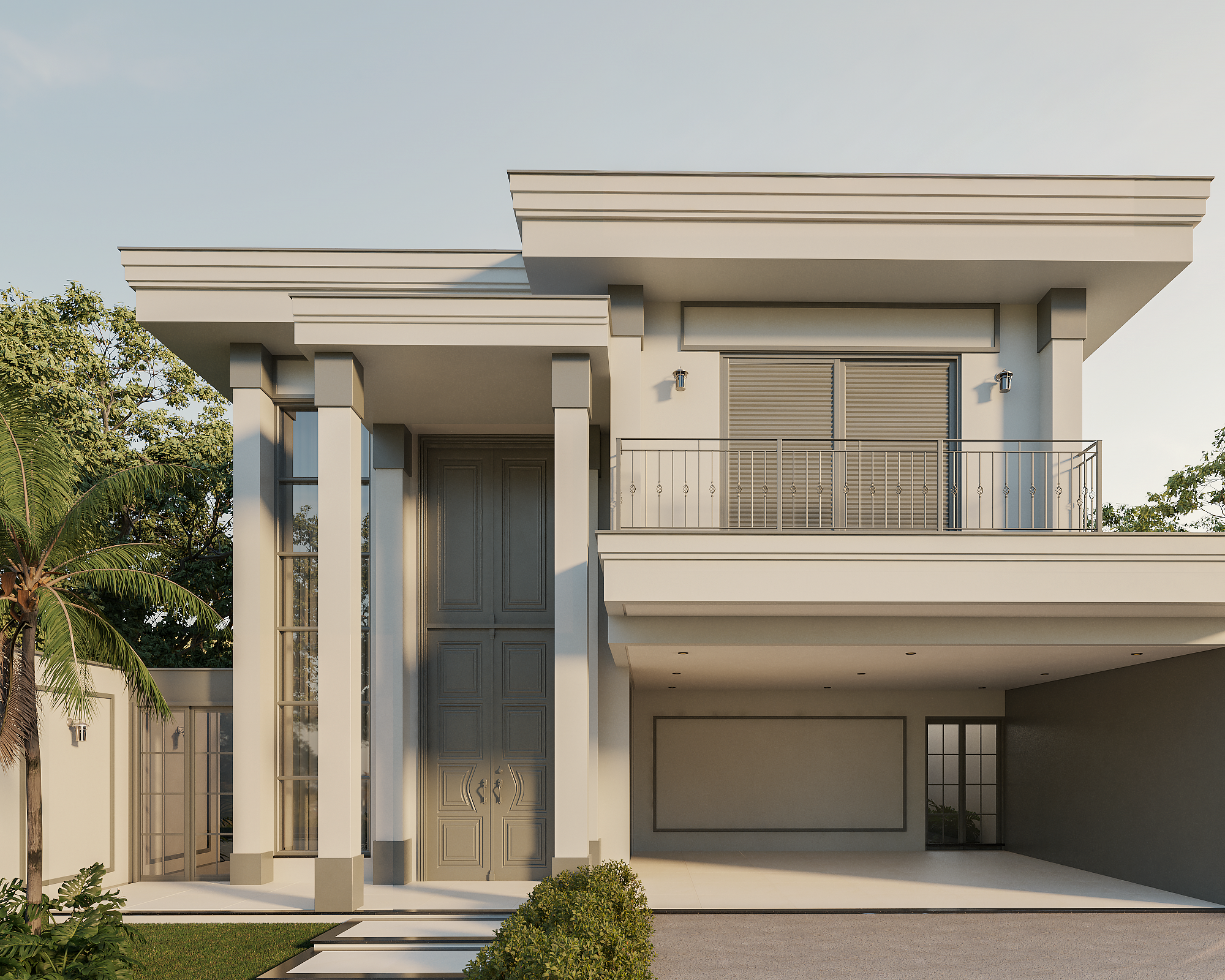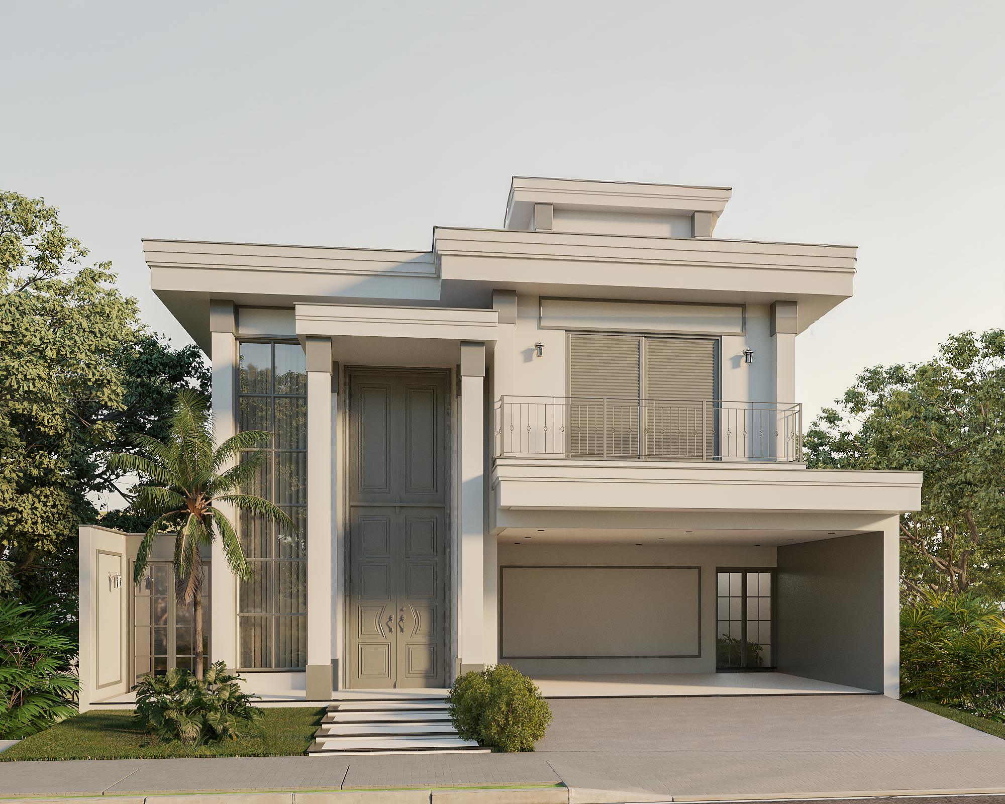 O ponto focal absoluto é a porta de entrada monumental, com pé-direito duplo. As molduras trabalhadas e as colunas estilizadas reforçam a verticalidade, conferindo uma escala palaciana à residência. Seguindo os preceitos clássicos, a fachada utiliza a simetria de massas para criar harmonia visual. O volume da garagem e do terraço superior equilibra-se com o grande painel de vidro lateral, que traz leveza à estrutura sólida. O uso de boiseries e molduras em relevo adiciona profundidade e textura, criando um jogo de luz e sombra refinado sobre a superfície clara. A ampla pele de vidro com divisórias quadriculadas é um aceno às grandes janelas coloniais e europeias, permitindo uma integração luminosa entre o exterior e o interior sem perder a privacidade da linguagem clássica.