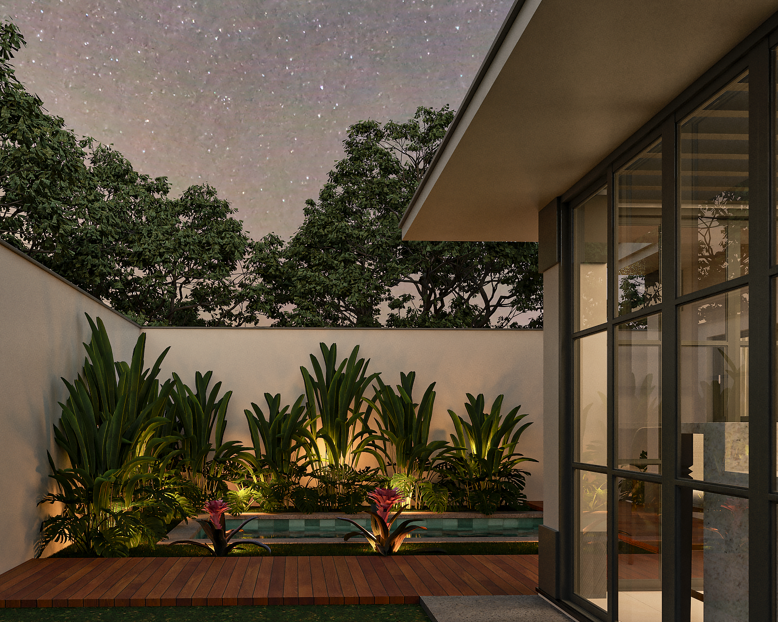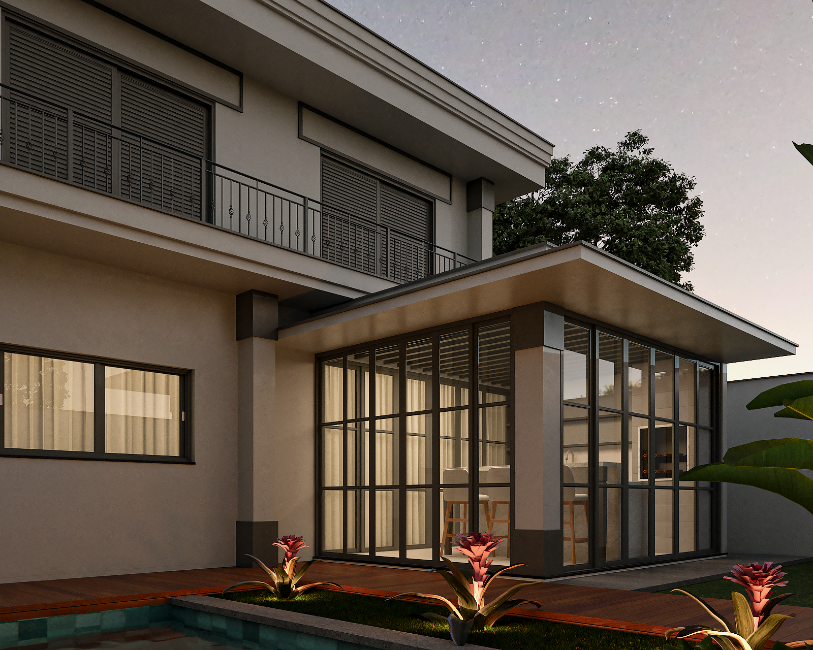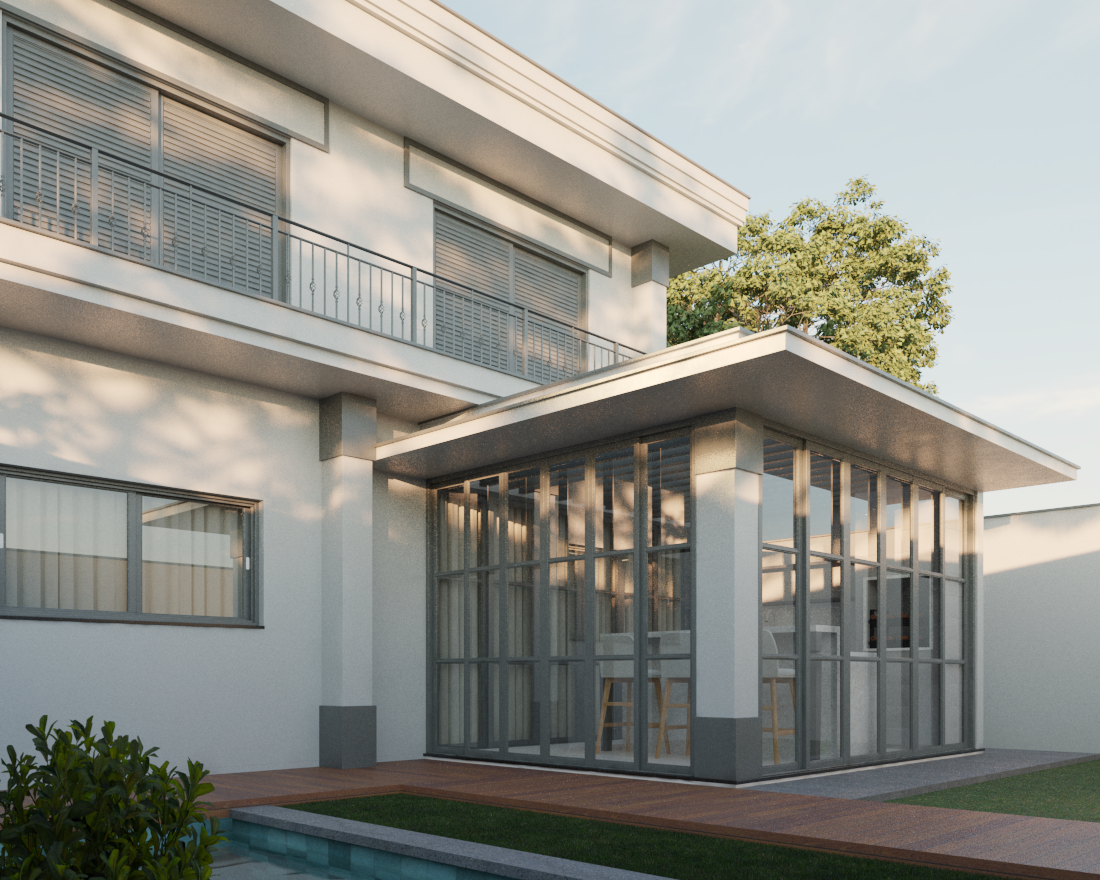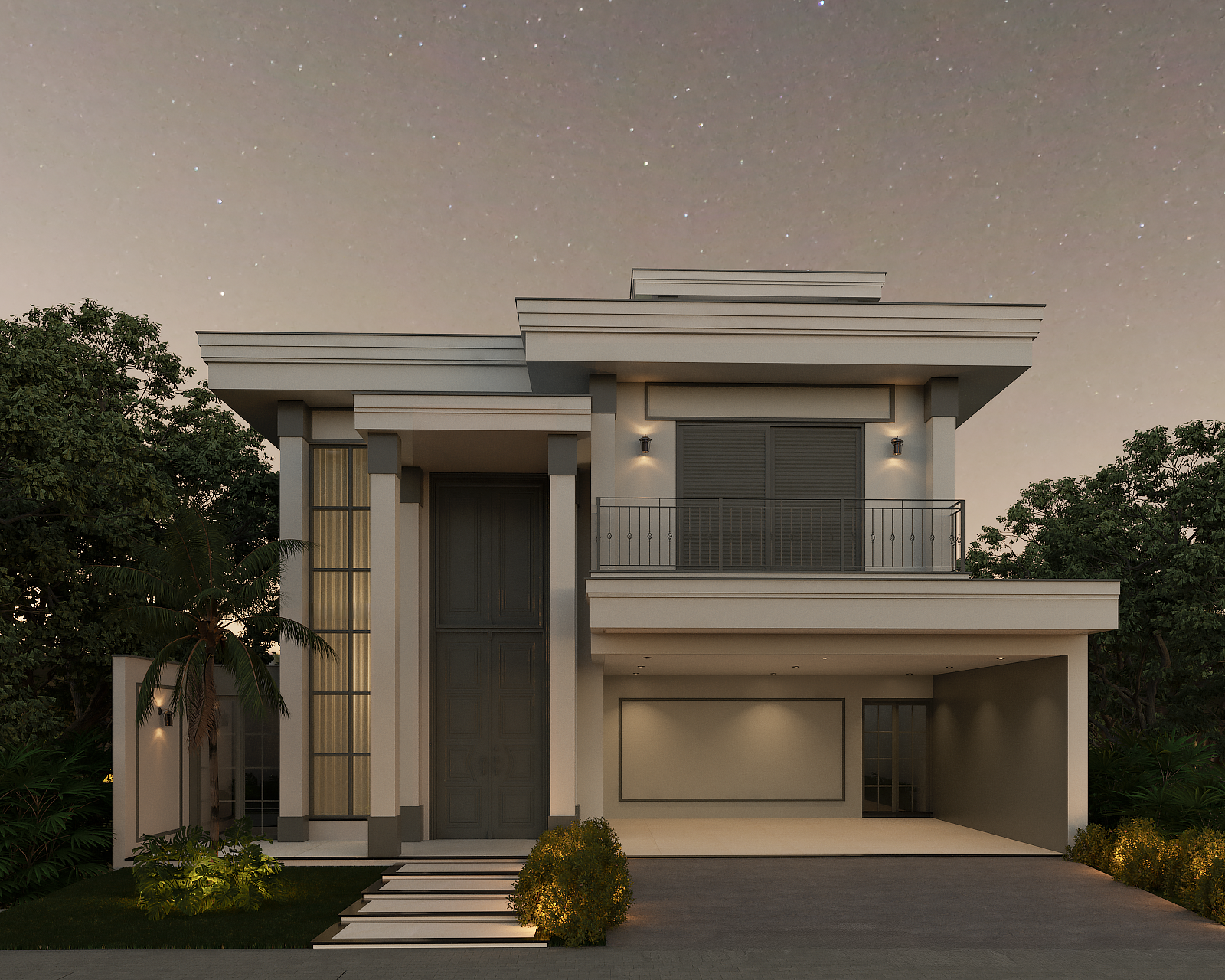 O ponto focal absoluto é a porta de entrada monumental, com pé-direito duplo. As molduras trabalhadas e as colunas estilizadas reforçam a verticalidade, conferindo uma escala palaciana à residência. Seguindo os preceitos clássicos, a fachada utiliza a simetria de massas para criar harmonia visual. O volume da garagem e do terraço superior equilibra-se com o grande painel de vidro lateral, que traz leveza à estrutura sólida. O uso de boiseries e molduras em relevo adiciona profundidade e textura, criando um jogo de luz e sombra refinado sobre a superfície clara. A ampla pele de vidro com divisórias quadriculadas é um aceno às grandes janelas coloniais e europeias, permitindo uma integração luminosa entre o exterior e o interior sem perder a privacidade da linguagem clássica.