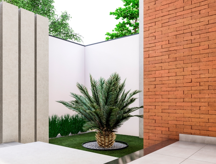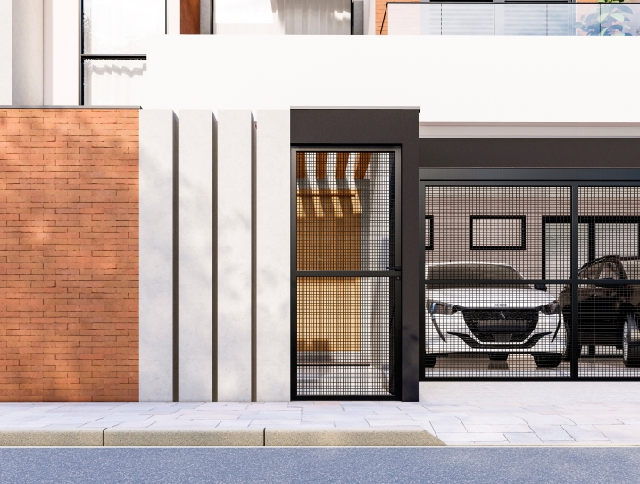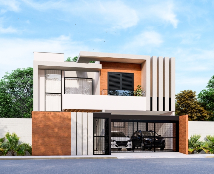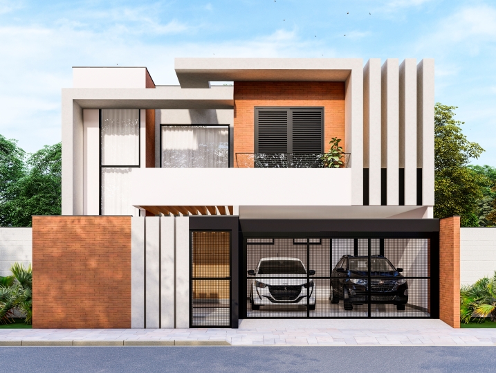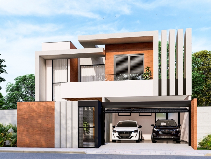 250m² de terreno, sendo 150m² destinados à construção. Proposta de casa com dois pavimentos, desenvolvida para equilibrar a fachada e garantir segurança e estética. A utilização do revestimento de tijolinhos confere rusticidade à composição, de forma leve e uniforme. As esquadrias e aplicações de metais na cor preta trazem um toque de modernidade atemporal.