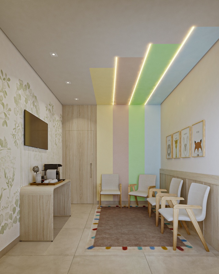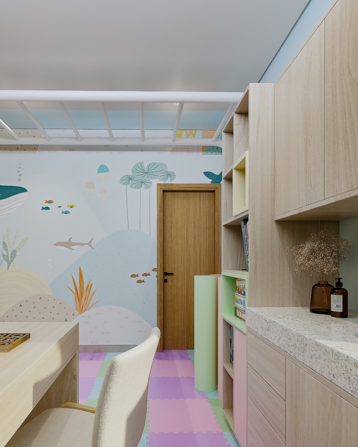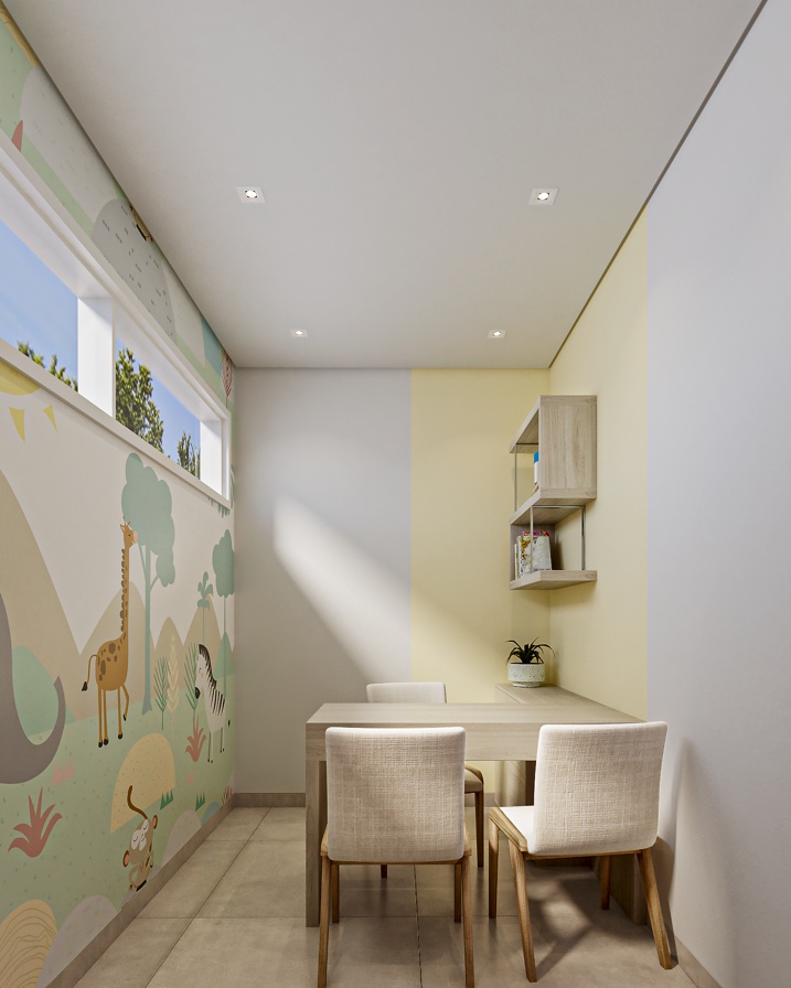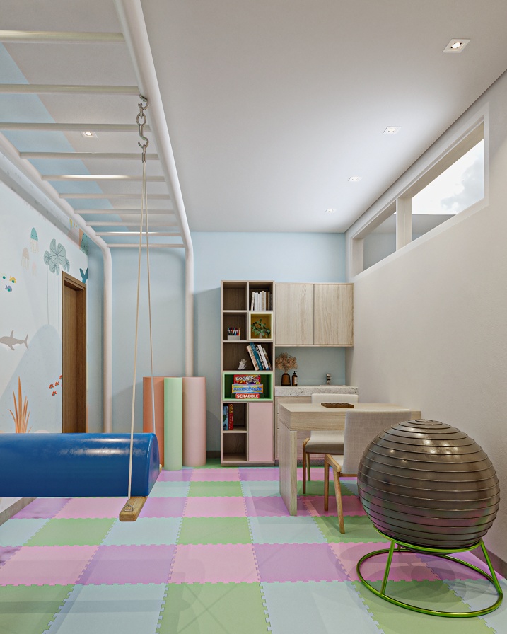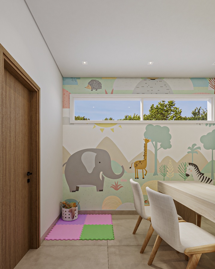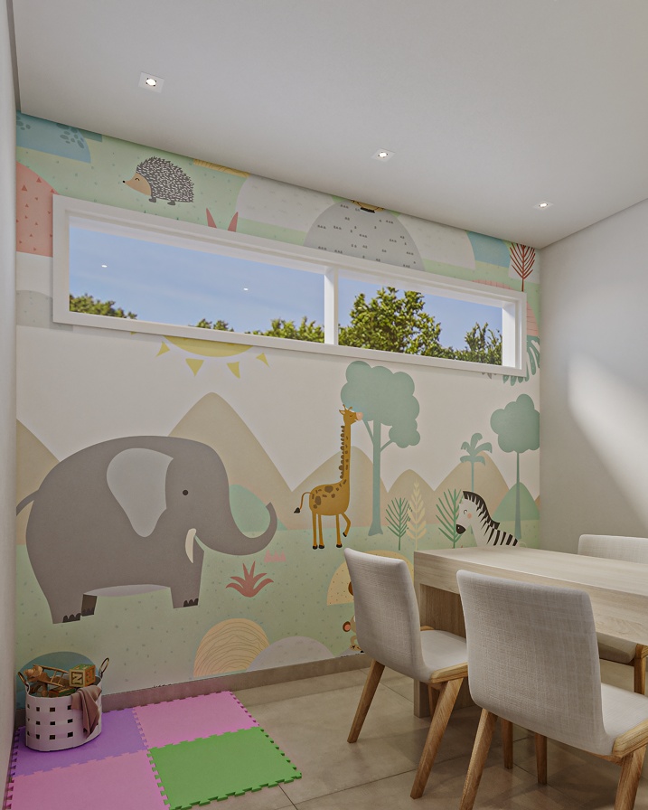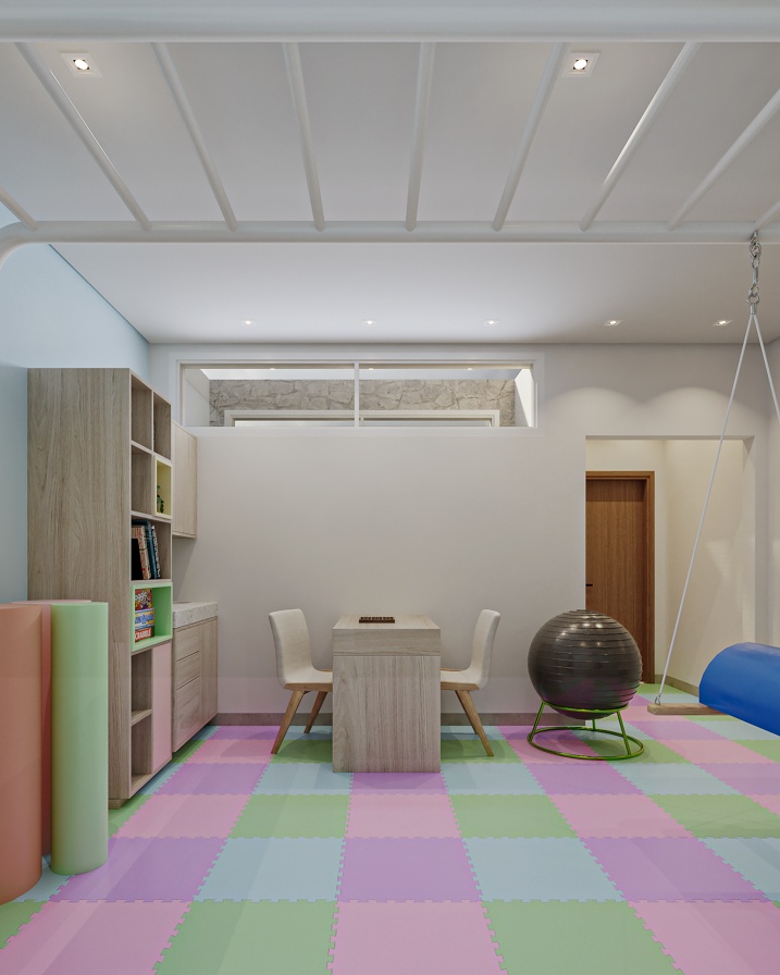 55,00m² de construção. Este projeto de clínica foi desenvolvido para atender às demandas da terapia ocupacional infantil, unindo acolhimento, ludicidade e funcionalidade. O espaço foi planejado para proporcionar segurança, conforto visual e estímulo sensorial de forma equilibrada. O piso em placas de EVA ou borracha colorida oferece proteção contra impactos, além de delimitar áreas de atividades motoras com um toque visual suave. As paredes receberam murais delicados com temas da natureza, em cores pastéis que estimulam sem causar excesso de informação, criando um ambiente tranquilo, alegre e familiar — ideal para o desenvolvimento infantil.