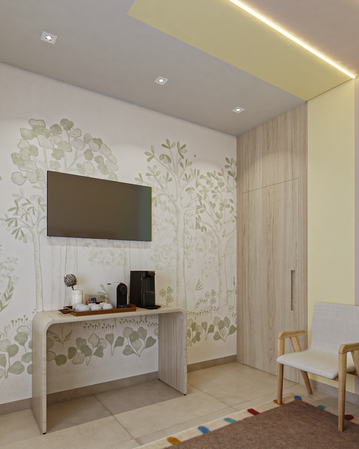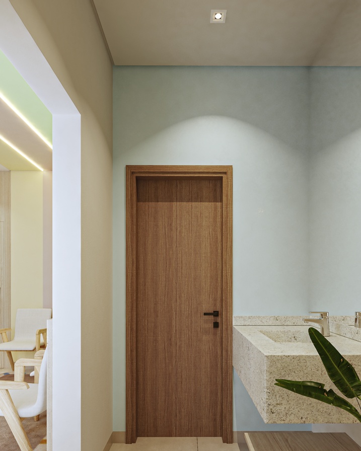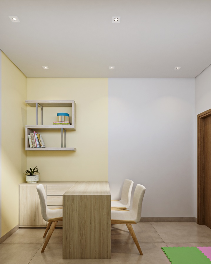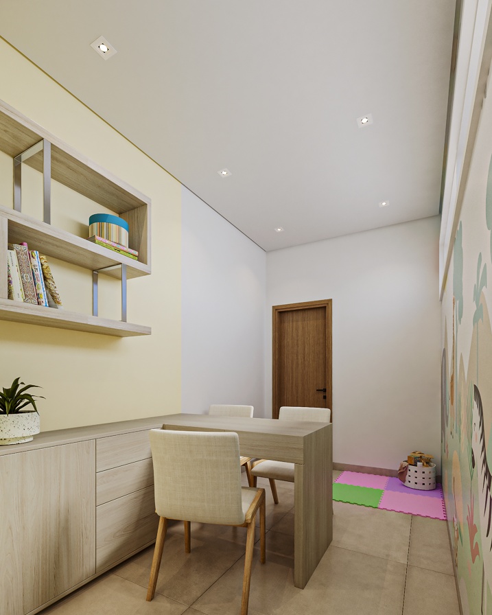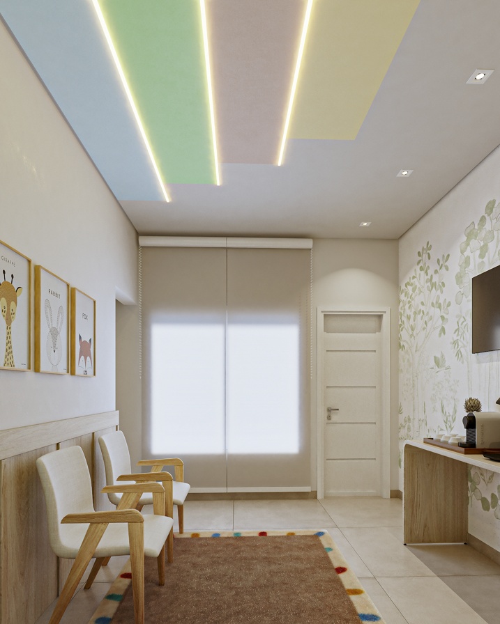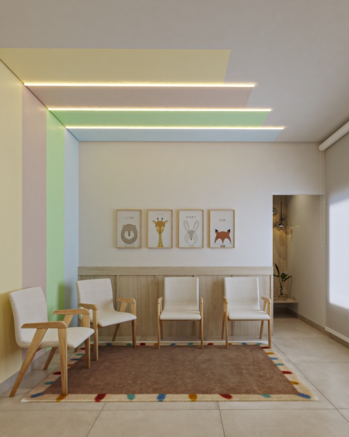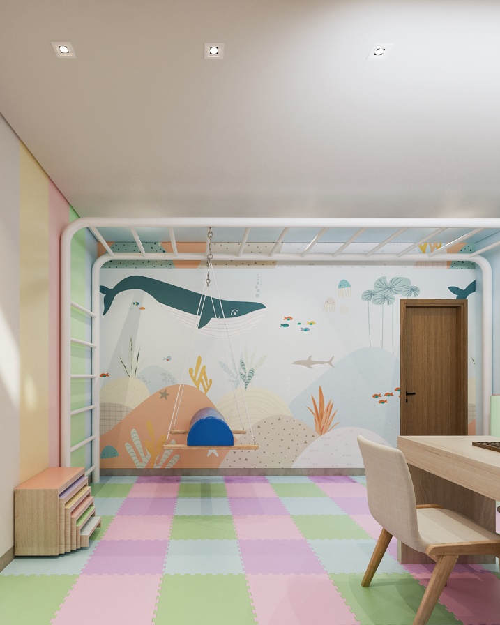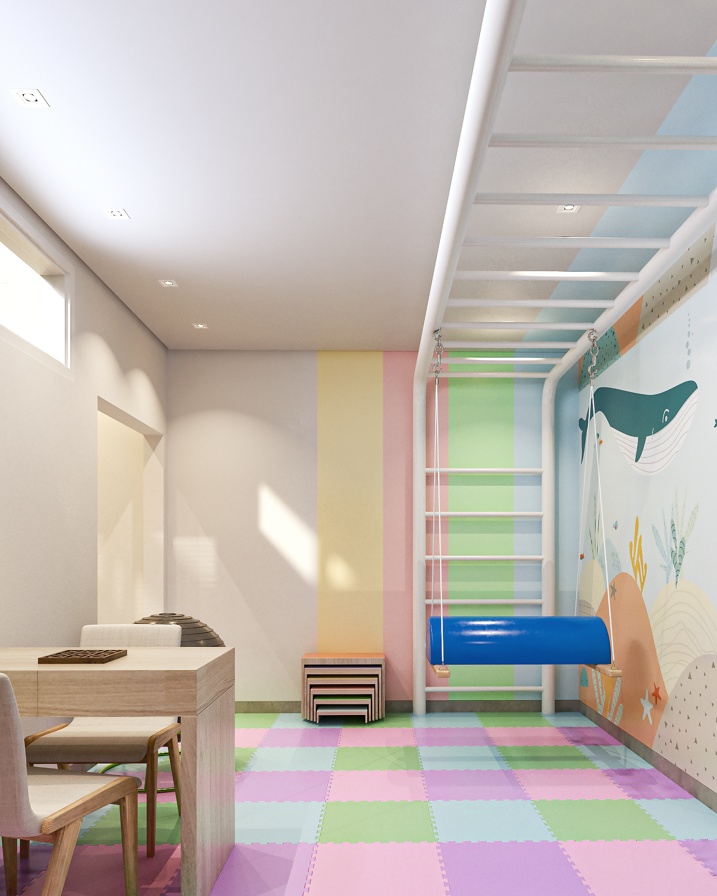 55,00m² de construção. Este projeto de clínica foi desenvolvido para atender às demandas da terapia ocupacional infantil, unindo acolhimento, ludicidade e funcionalidade. O espaço foi planejado para proporcionar segurança, conforto visual e estímulo sensorial de forma equilibrada. O piso em placas de EVA ou borracha colorida oferece proteção contra impactos, além de delimitar áreas de atividades motoras com um toque visual suave. As paredes receberam murais delicados com temas da natureza, em cores pastéis que estimulam sem causar excesso de informação, criando um ambiente tranquilo, alegre e familiar — ideal para o desenvolvimento infantil.