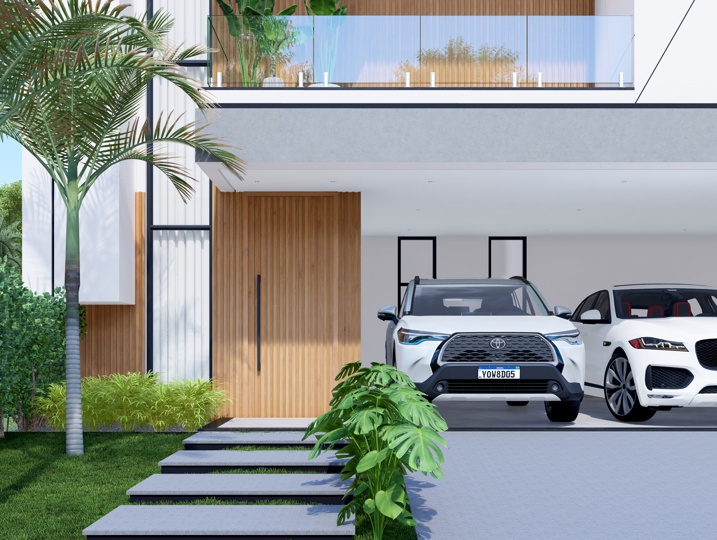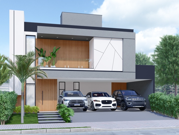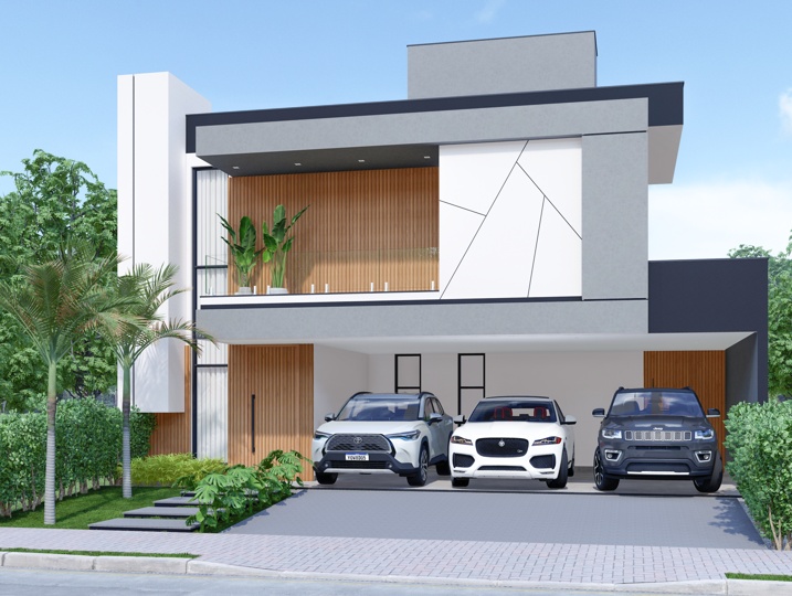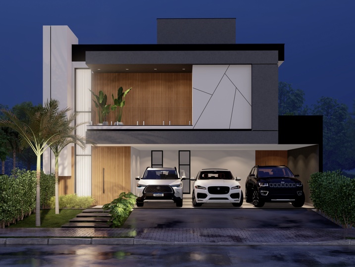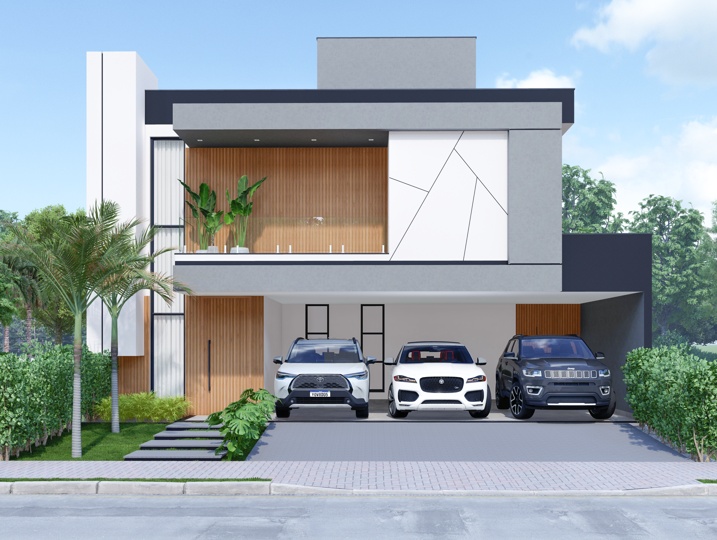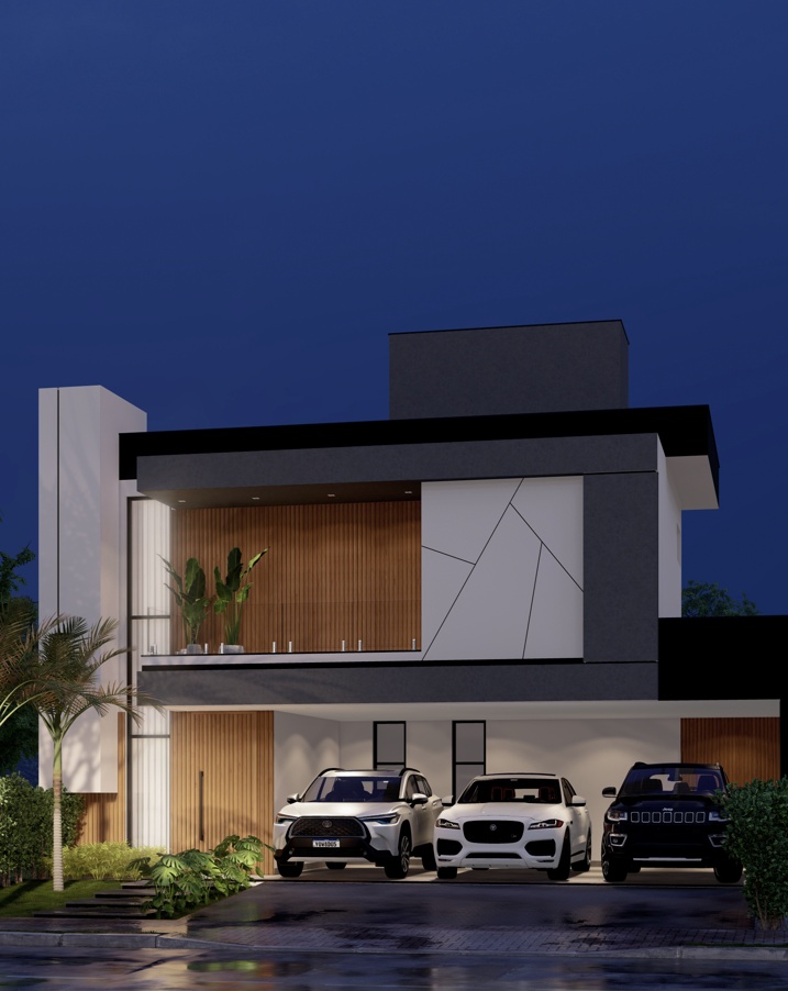 288,42m² de terreno, sendo 272,80m² de construção. A residência é projetada em dois pavimentos, explorando a horizontalidade e a verticalidade através de planos recuados e avançados. O volume principal é definido por grandes planos cinza e branco, enquadrando os elementos de destaque. Um extenso painel ripado de madeira clara domina a fachada superior, introduzindo calor e textura, além de funcionar como um elemento de filtro e privacidade para o andar superior.