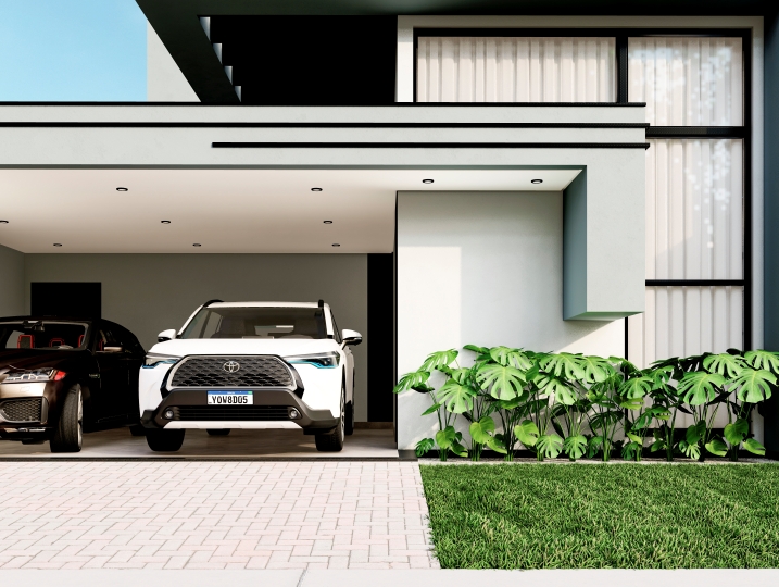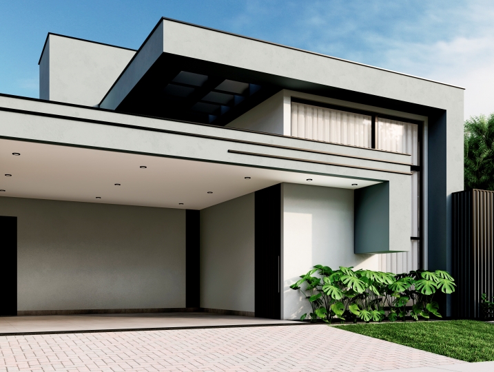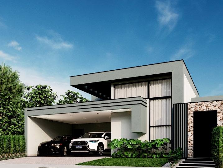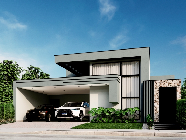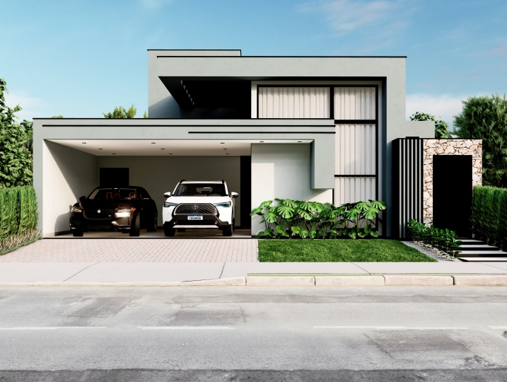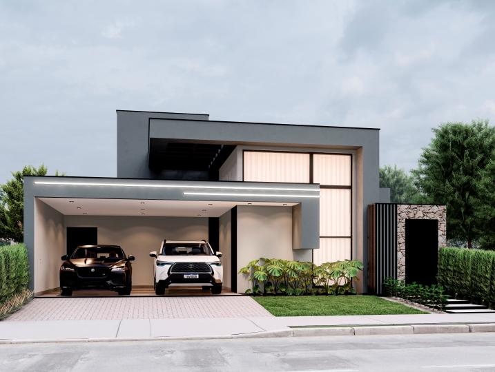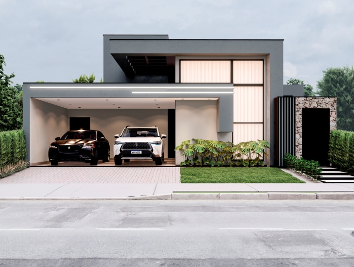 284,25m² de terreno, sendo 166,78m² de construção. Fachada contemporânea que explora a pureza dos volumes e o contraste entre as cores neutras. O projeto prioriza o design limpo e a integração sutil com a natureza. Grandes aberturas verticais e um balanço marcante. O uso de texturas, como concreto e pedra, adiciona profundidade ao design. O destaque fica por conta do painel de pedra filetada que emoldura a entrada e contrasta com a leveza do volume superior.